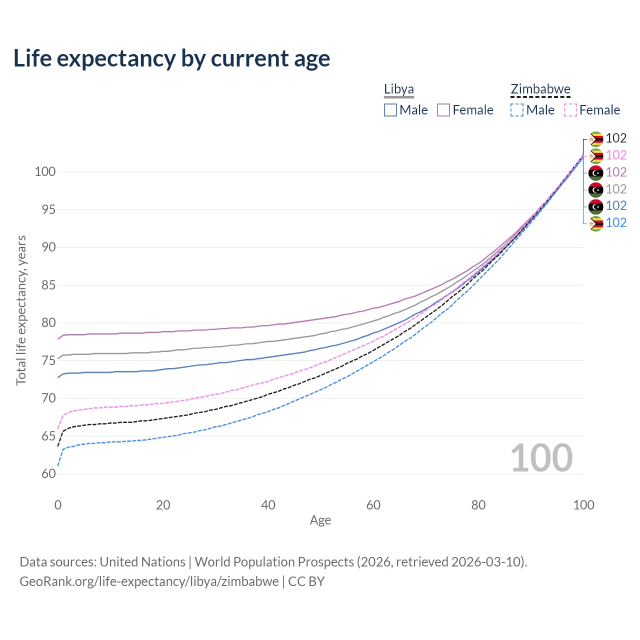 This life expectancy calculator shows the odds of living to 100, 95, 90, and below based on current age for both males and females in Libya and Zimbabwe, along with mean and median age of death. The calculations are based on the 2026 life tables (actuarial tables) from the UN World Population Prospects.