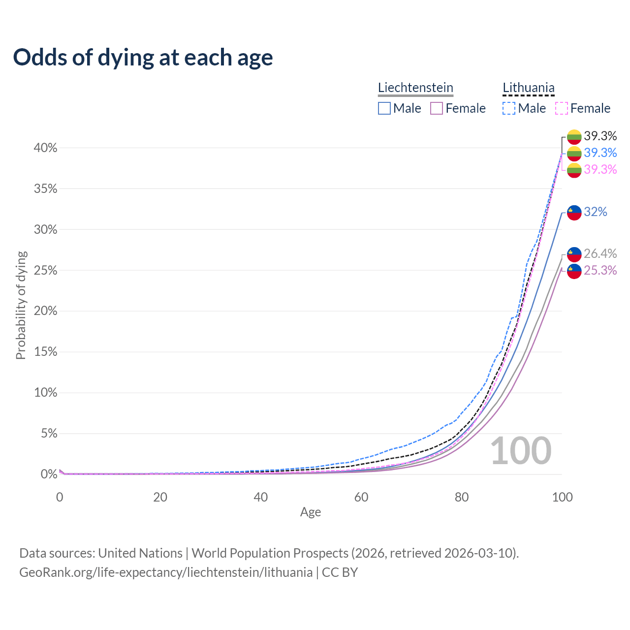 This life expectancy calculator shows the odds of living to 100, 95, 90, and below based on current age for both males and females in Liechtenstein and Lithuania, along with mean and median age of death. The calculations are based on the 2026 life tables (actuarial tables) from the UN World Population Prospects.