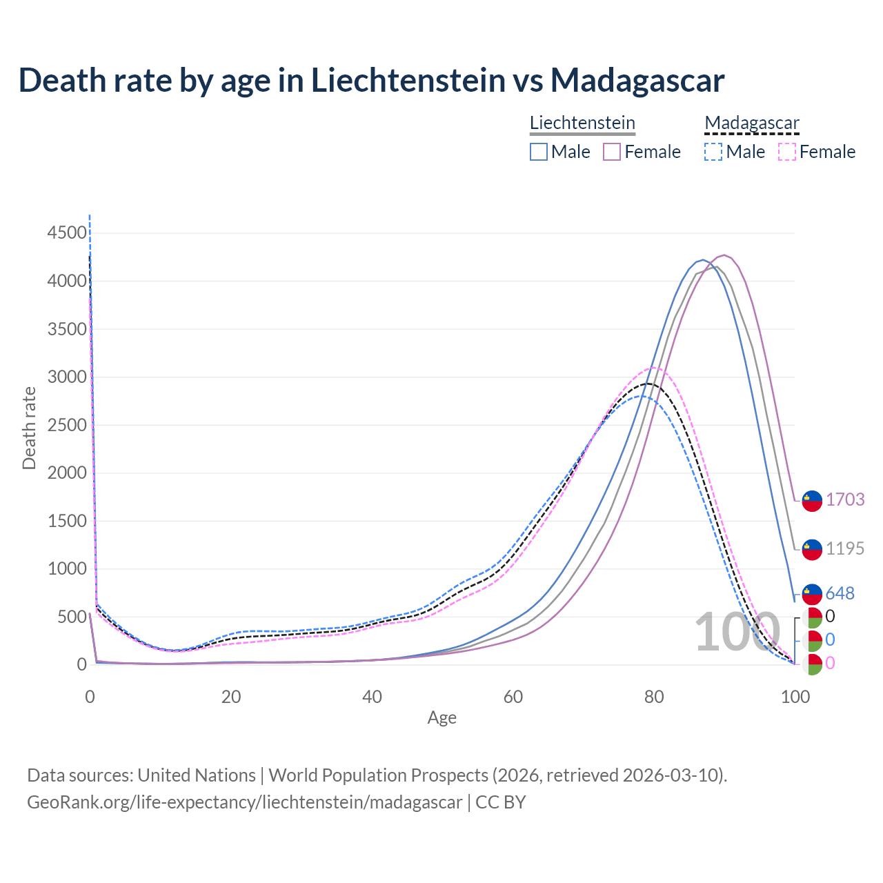 In Liechtenstein, the most common age of death is 89, compared to 0 in Madagascar. The median age of death is 86.3 in Liechtenstein and 72.2 in Madagascar, meaning only half of each cohort is expected to live past that age.