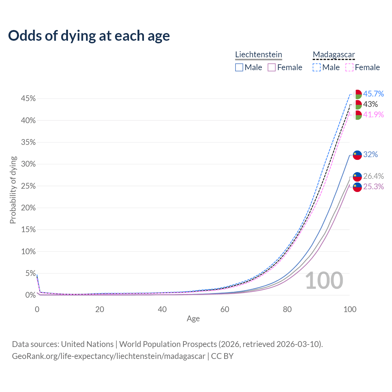 This life expectancy calculator shows the odds of living to 100, 95, 90, and below based on current age for both males and females in Liechtenstein and Madagascar, along with mean and median age of death. The calculations are based on the 2026 life tables (actuarial tables) from the UN World Population Prospects.