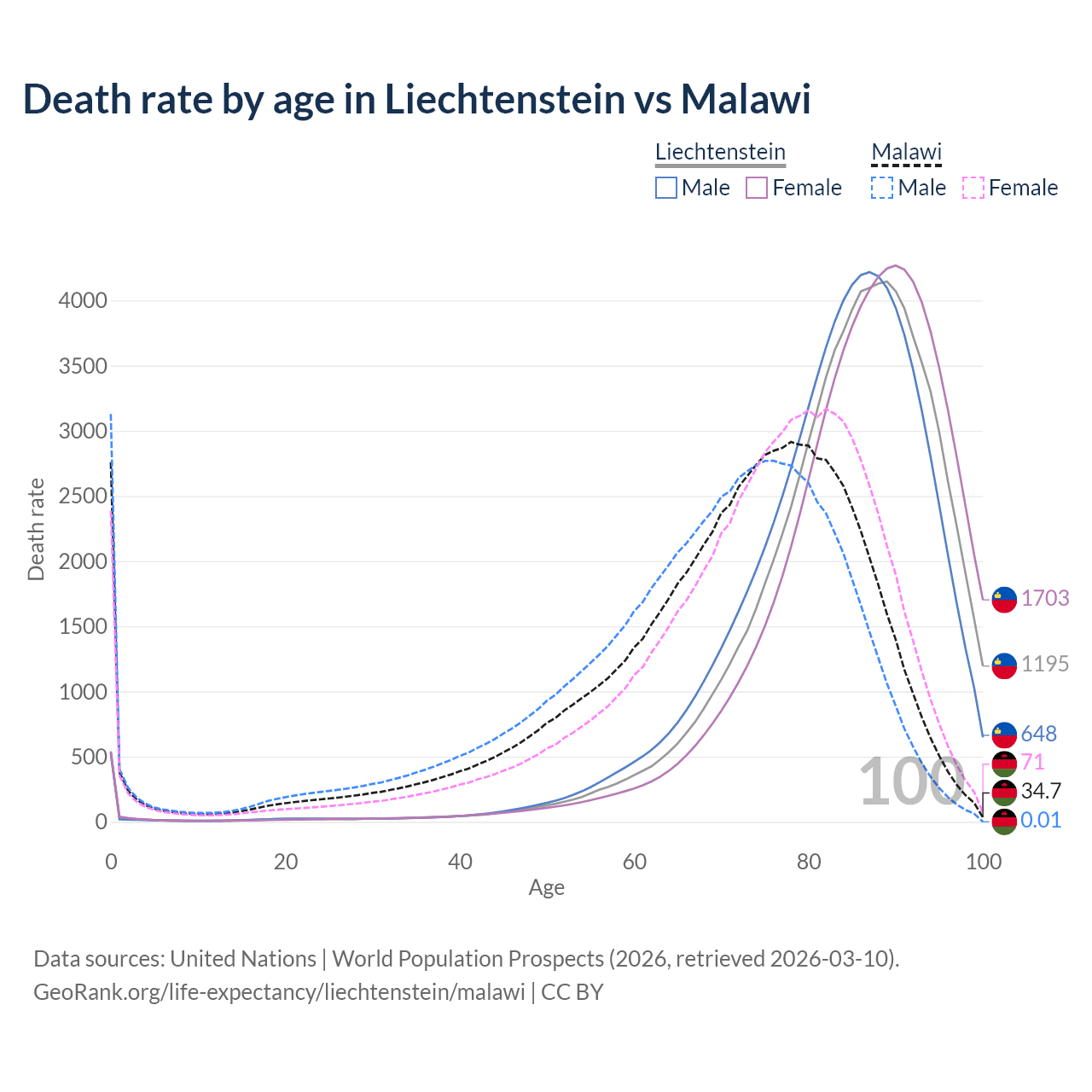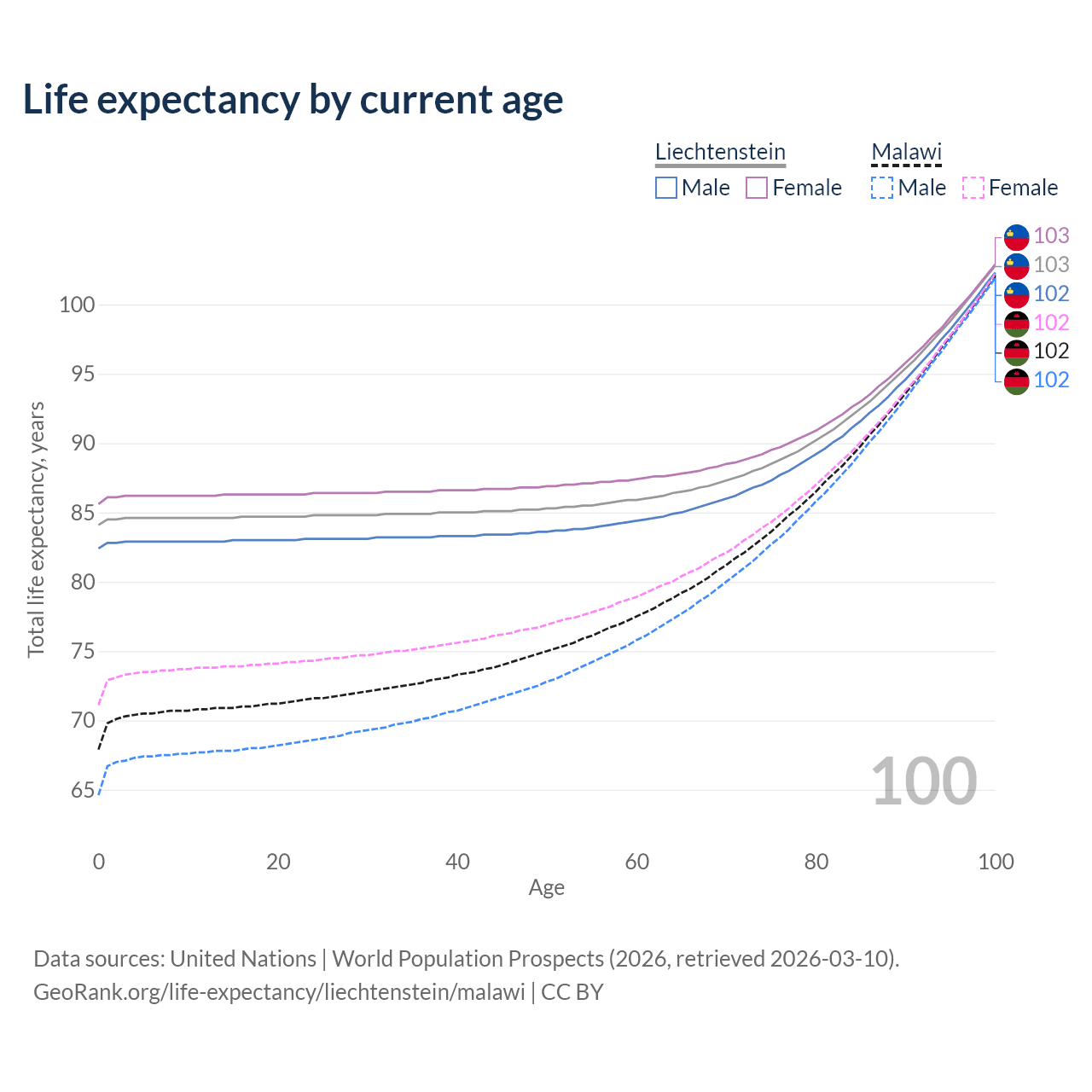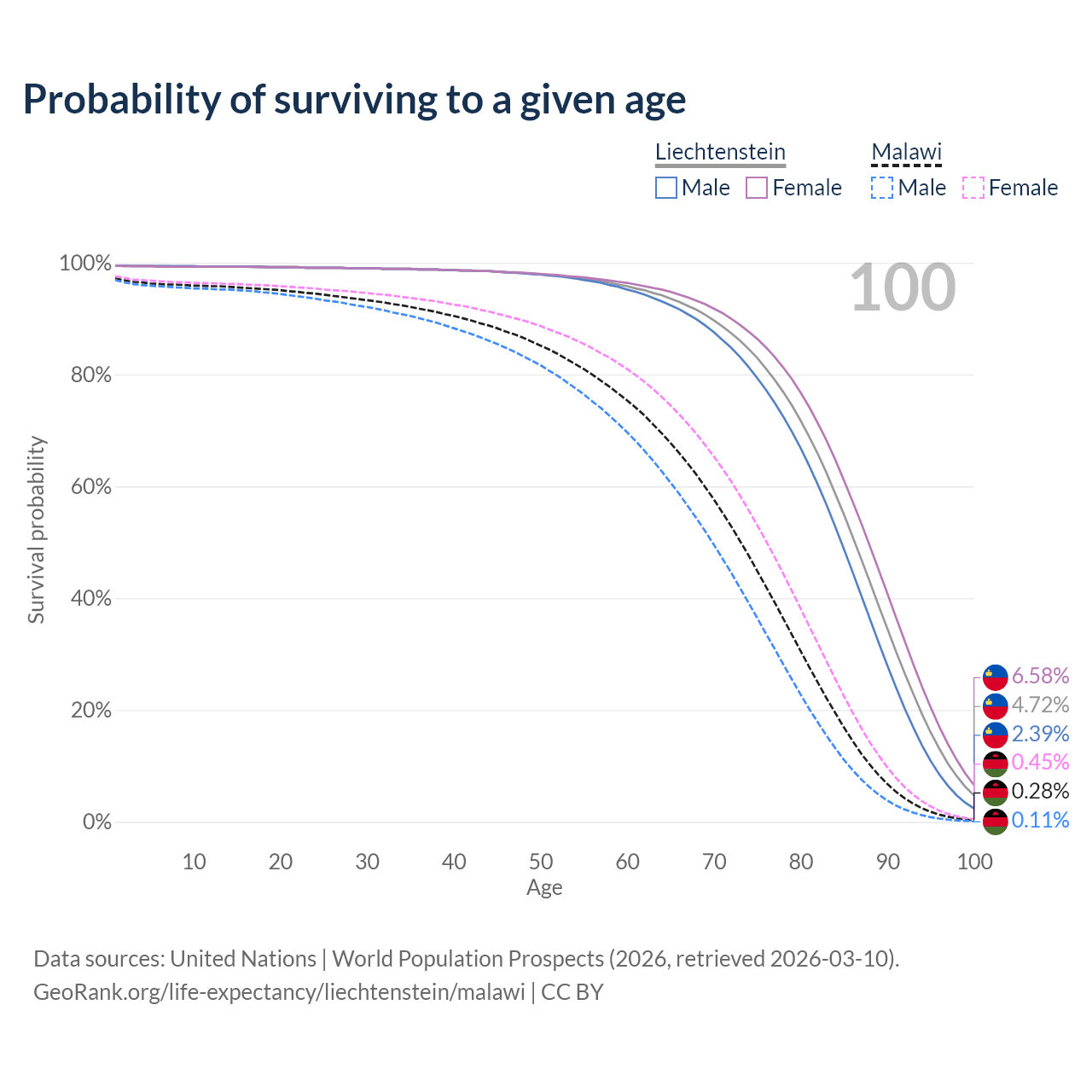 This life expectancy calculator shows the odds of living to 100, 95, 90, and below based on current age for both males and females in Liechtenstein and Malawi, along with mean and median age of death. The calculations are based on the 2026 life tables (actuarial tables) from the UN World Population Prospects.