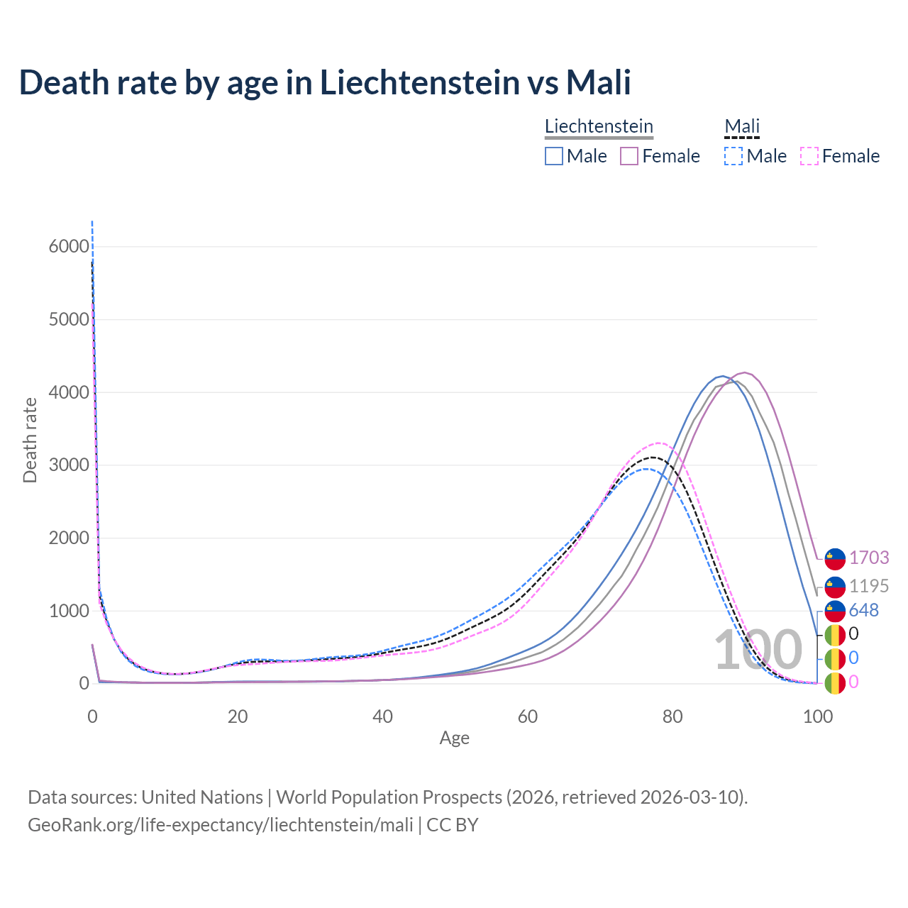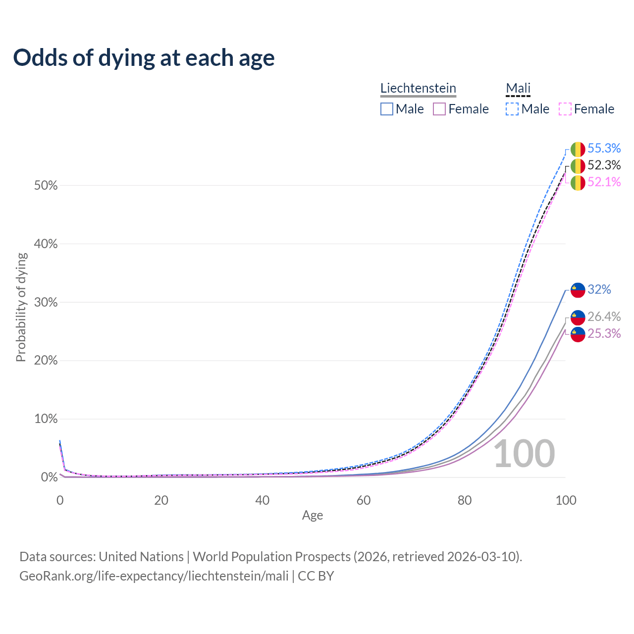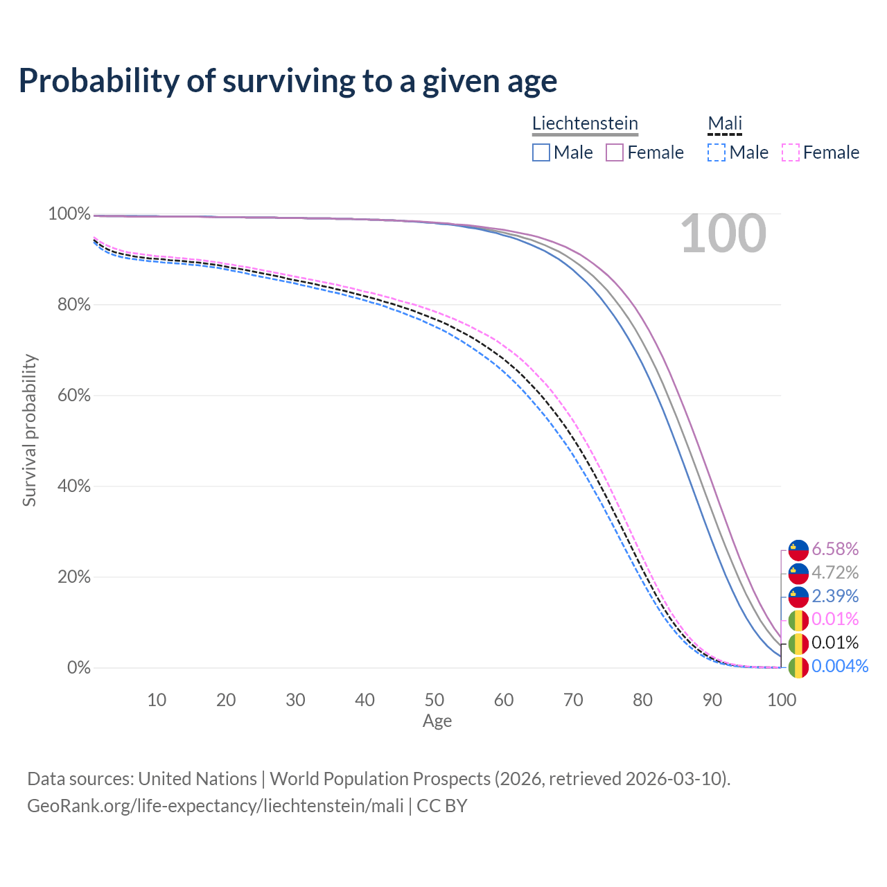This life expectancy calculator shows the odds of living to 100, 95, 90, and below based on current age for both males and females in Liechtenstein and Mali, along with mean and median age of death. The calculations are based on the 2026 life tables (actuarial tables) from the UN World Population Prospects.