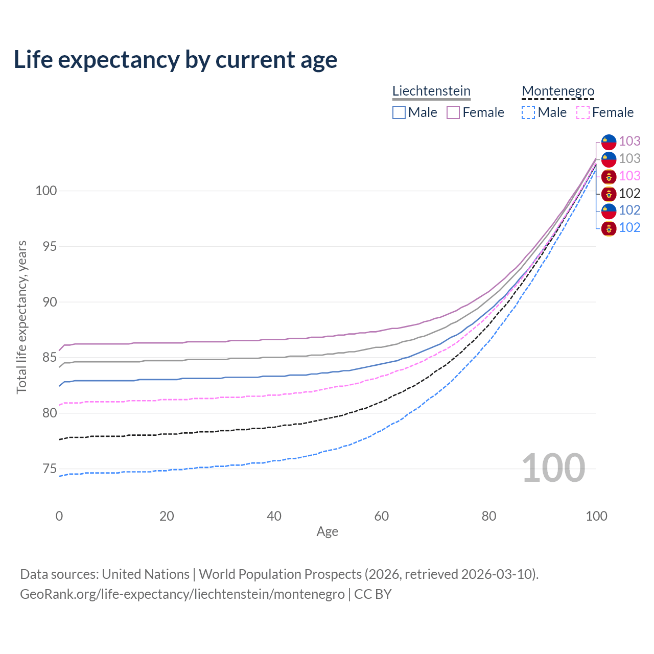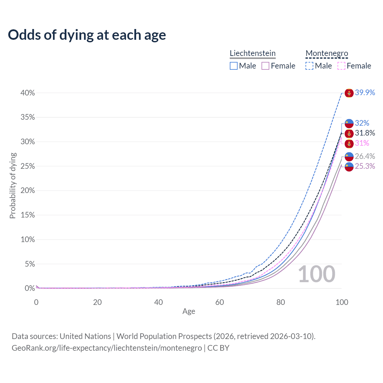 This life expectancy calculator shows the odds of living to 100, 95, 90, and below based on current age for both males and females in Liechtenstein and Montenegro, along with mean and median age of death. The calculations are based on the 2026 life tables (actuarial tables) from the UN World Population Prospects.