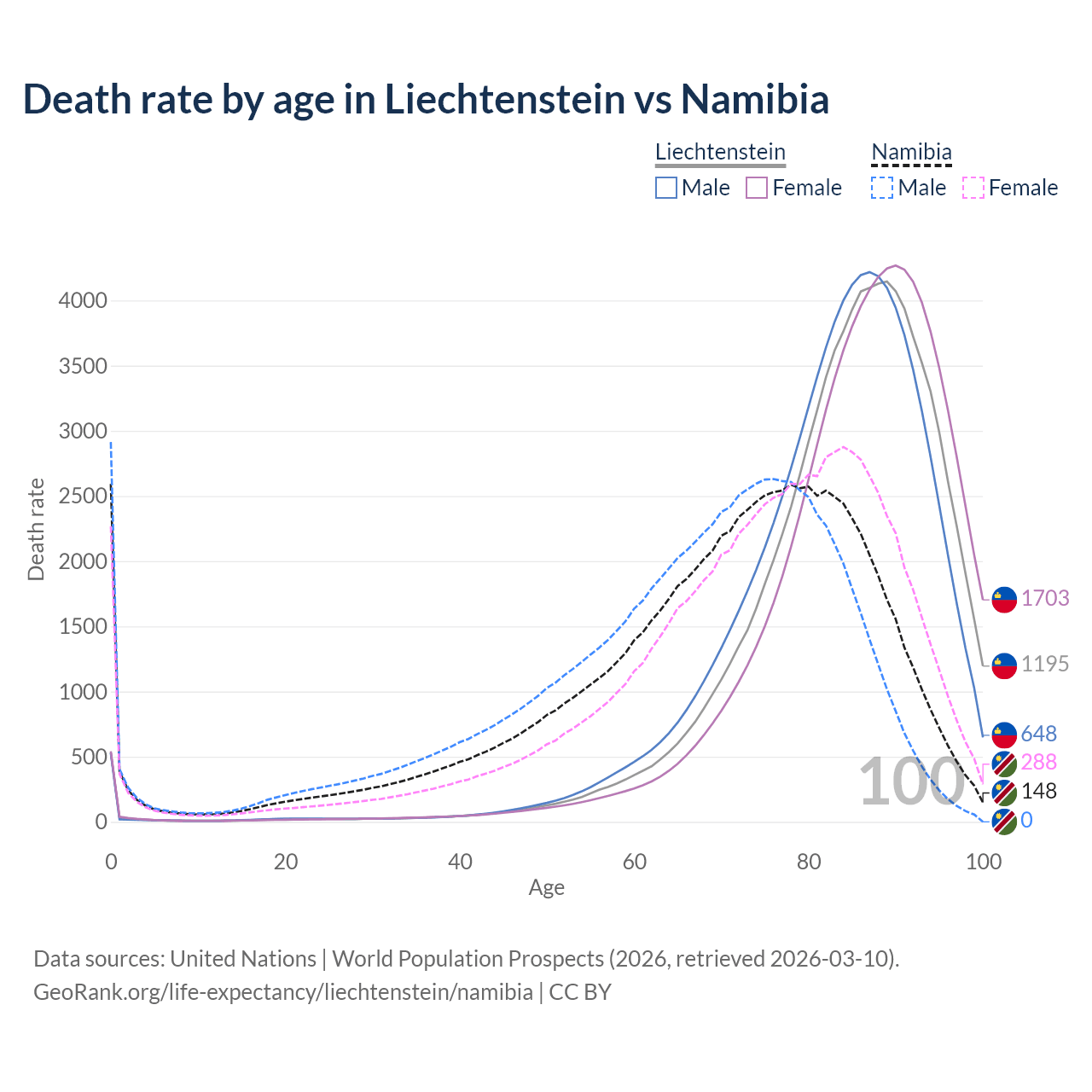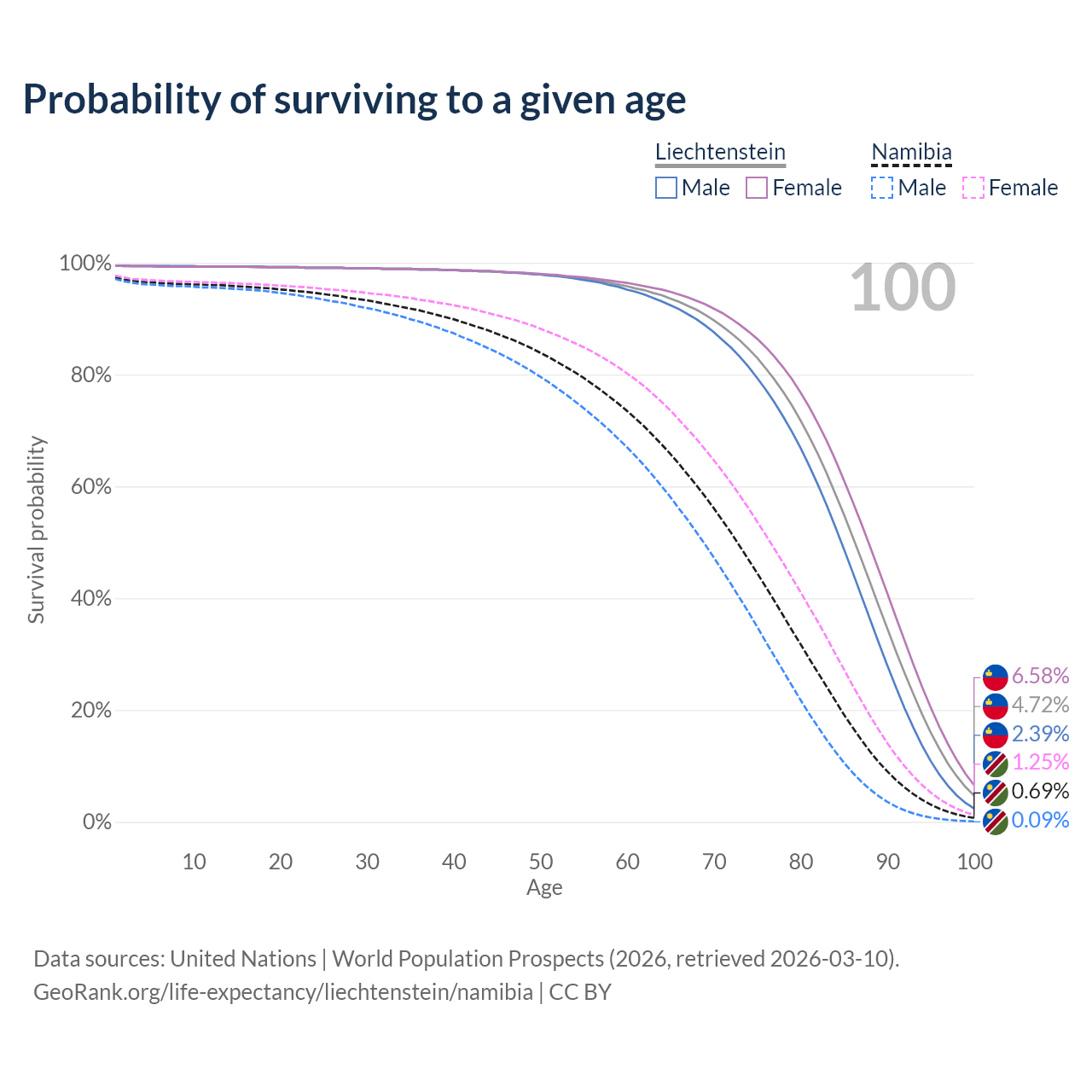 This life expectancy calculator shows the odds of living to 100, 95, 90, and below based on current age for both males and females in Liechtenstein and Namibia, along with mean and median age of death. The calculations are based on the 2026 life tables (actuarial tables) from the UN World Population Prospects.