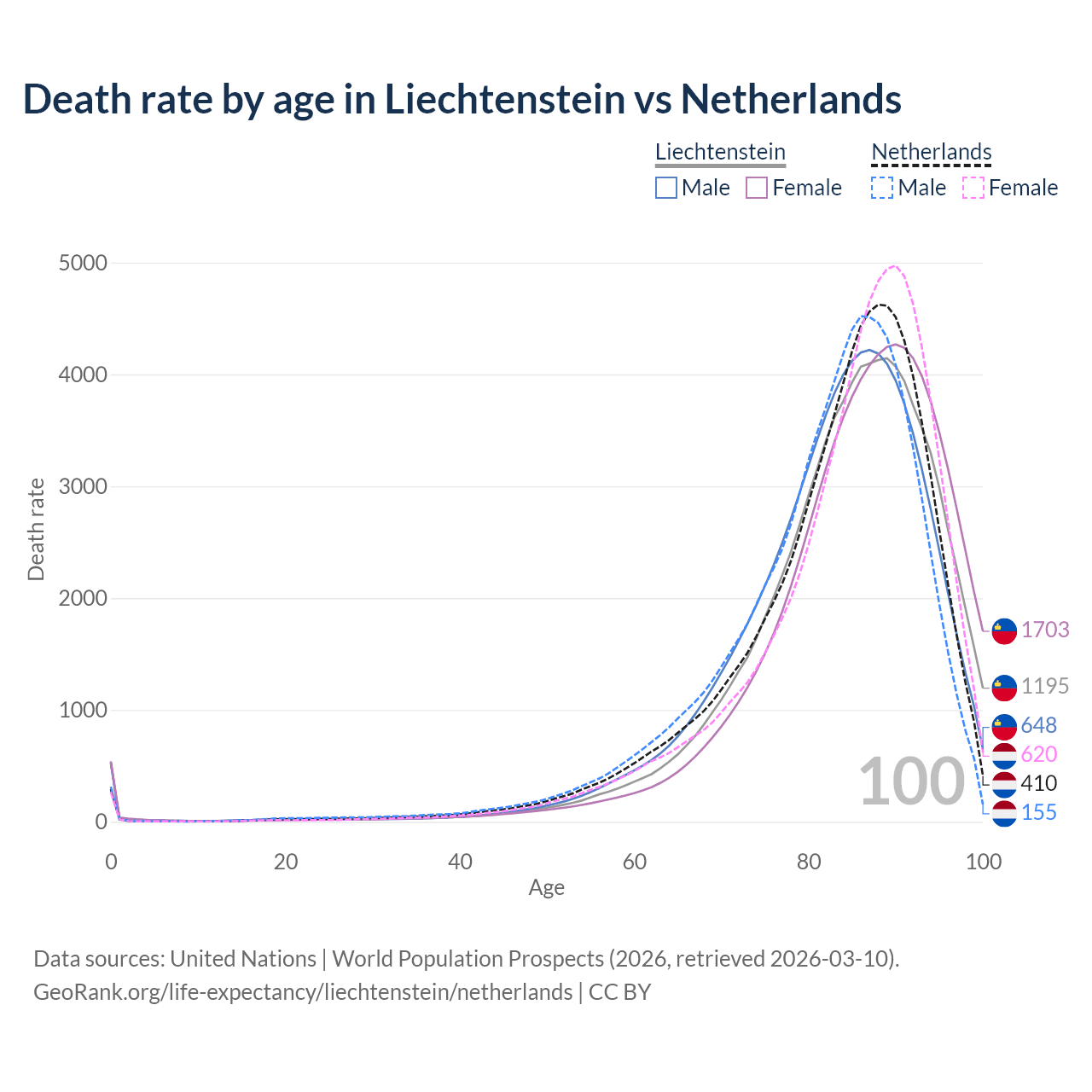 In Liechtenstein, the most common age of death is 89, compared to 88 in the Netherlands. The median age of death is 86.3 in Liechtenstein and 85.5 in the Netherlands, meaning only half of each cohort is expected to live past that age.
