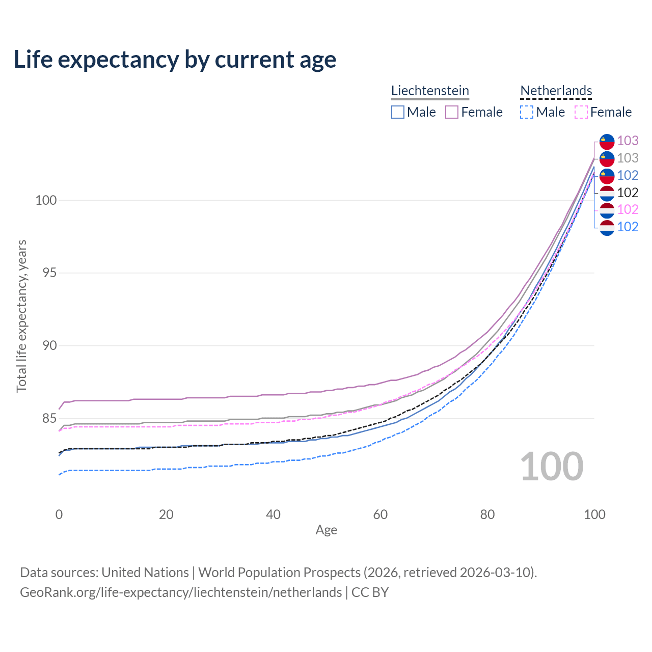 This life expectancy calculator shows the odds of living to 100, 95, 90, and below based on current age for both males and females in Liechtenstein and the Netherlands, along with mean and median age of death. The calculations are based on the 2026 life tables (actuarial tables) from the UN World Population Prospects.