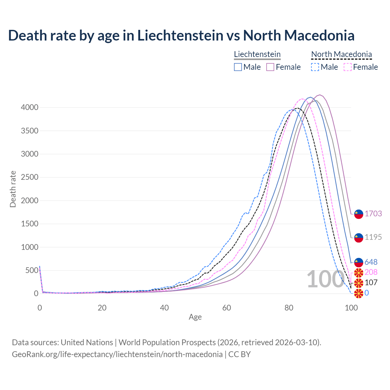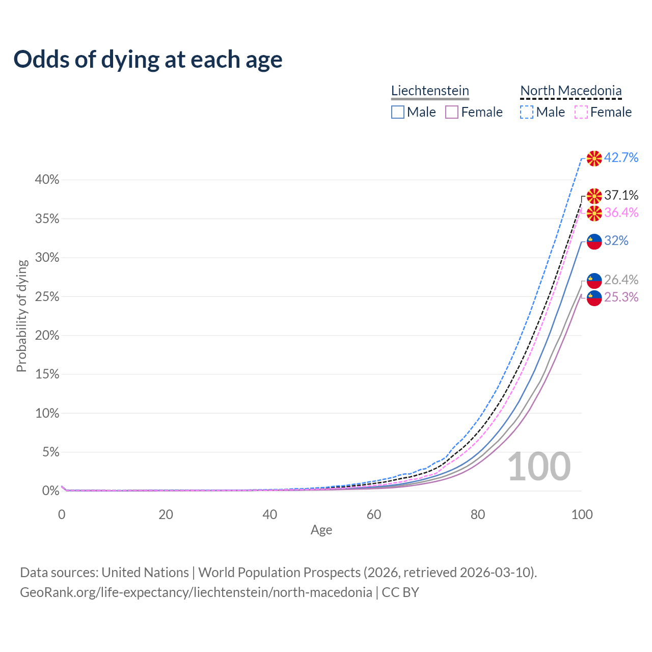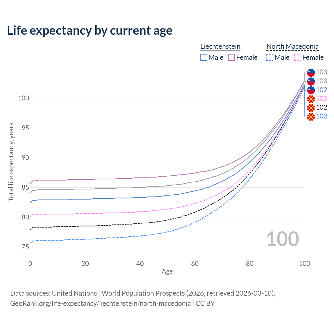 This life expectancy calculator shows the odds of living to 100, 95, 90, and below based on current age for both males and females in Liechtenstein and North Macedonia, along with mean and median age of death. The calculations are based on the 2026 life tables (actuarial tables) from the UN World Population Prospects.