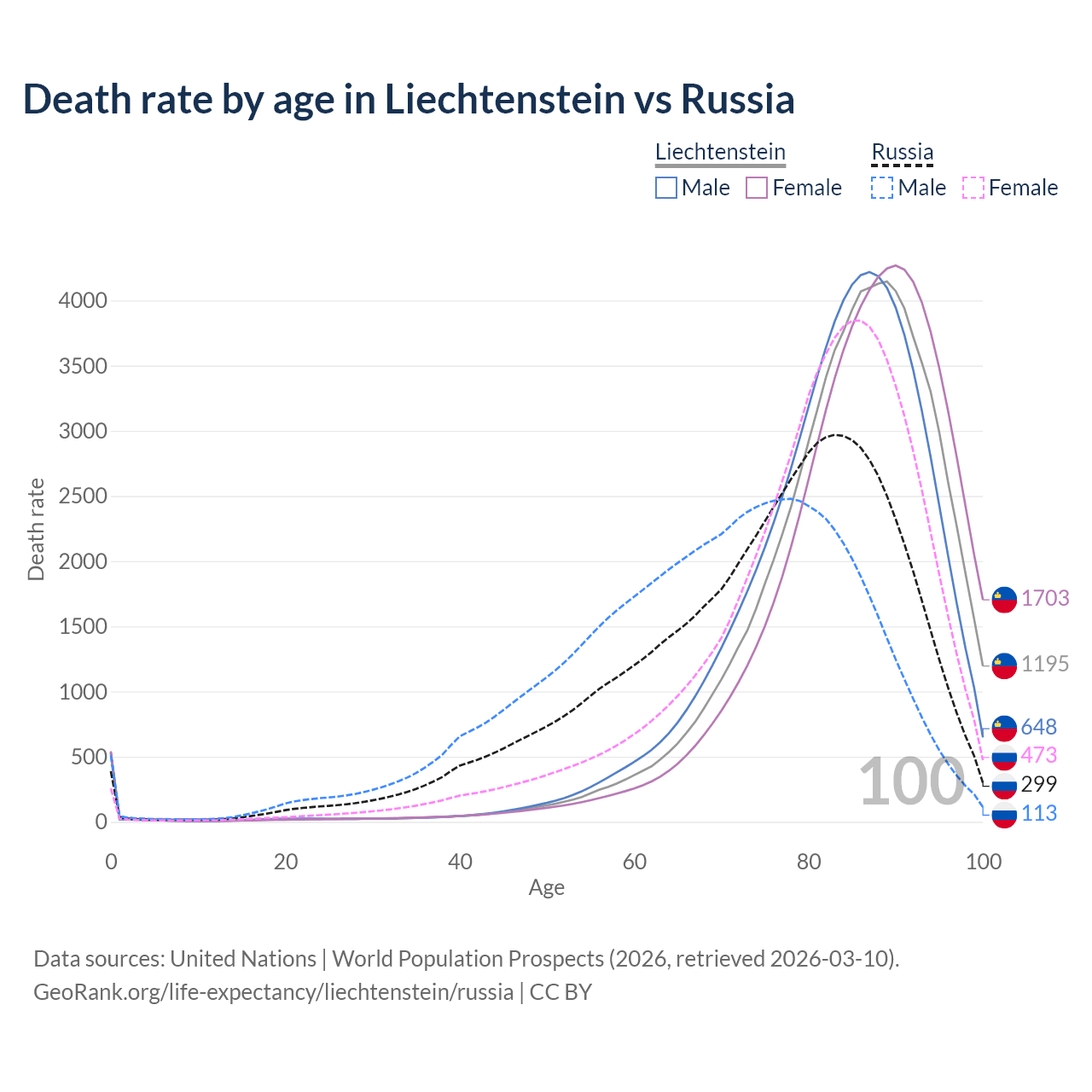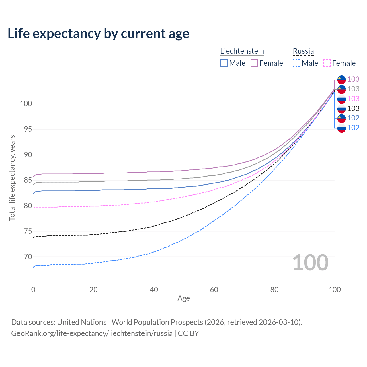 This life expectancy calculator shows the odds of living to 100, 95, 90, and below based on current age for both males and females in Liechtenstein and Russia, along with mean and median age of death. The calculations are based on the 2026 life tables (actuarial tables) from the UN World Population Prospects.