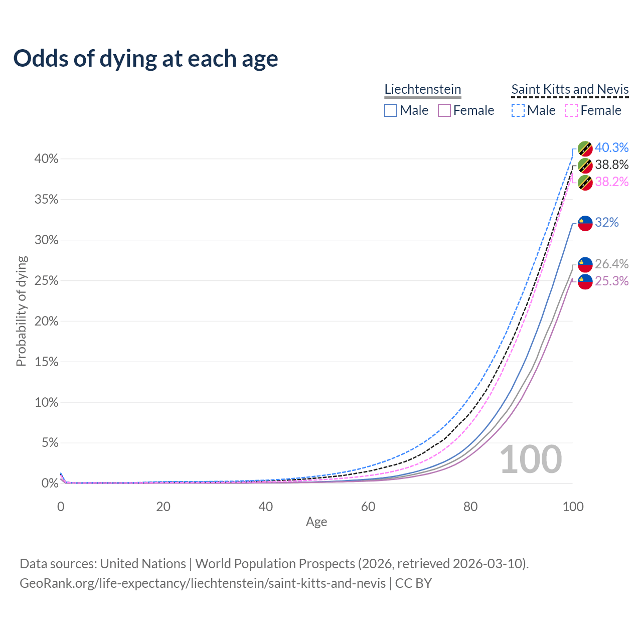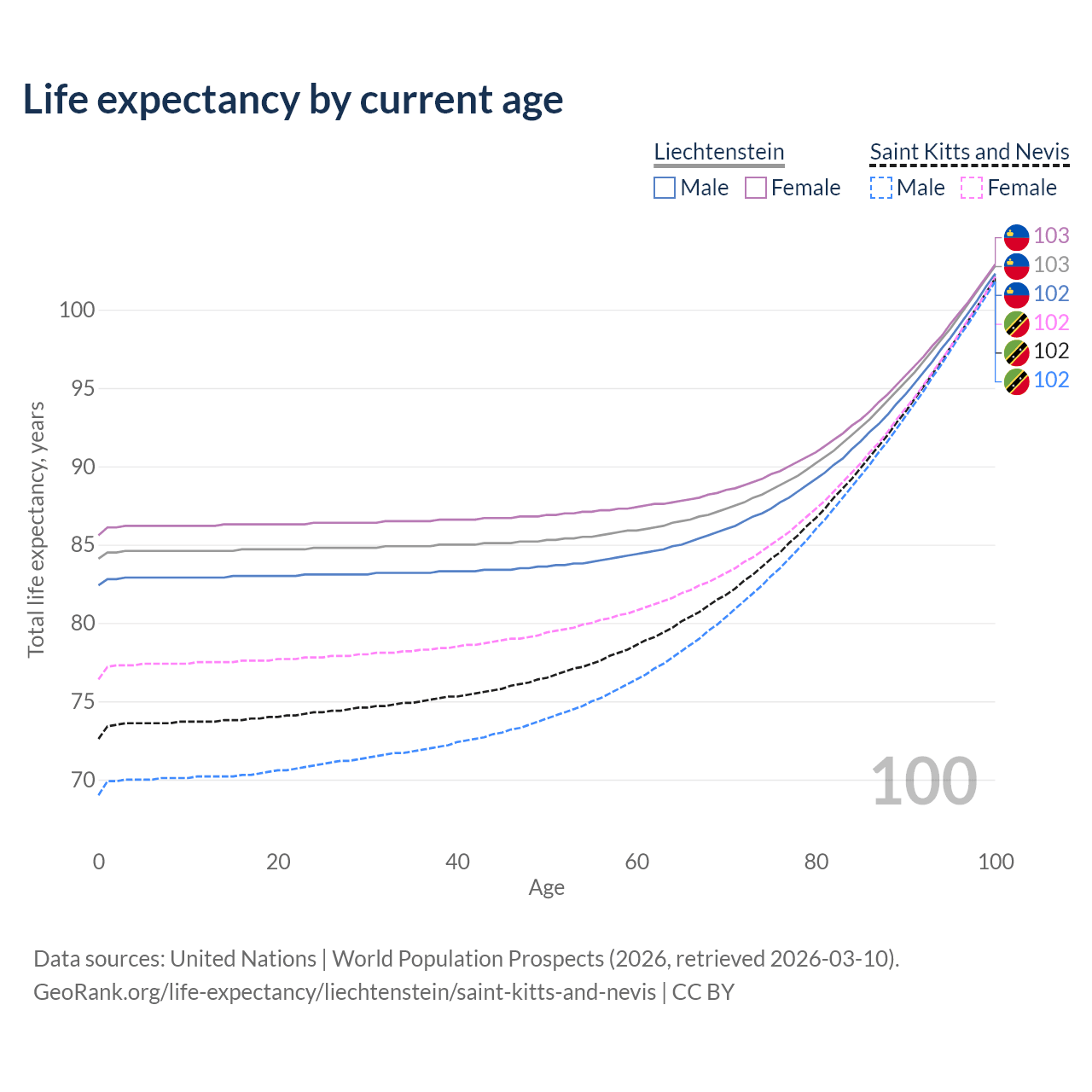 This life expectancy calculator shows the odds of living to 100, 95, 90, and below based on current age for both males and females in Liechtenstein and Saint Kitts and Nevis, along with mean and median age of death. The calculations are based on the 2026 life tables (actuarial tables) from the UN World Population Prospects.
