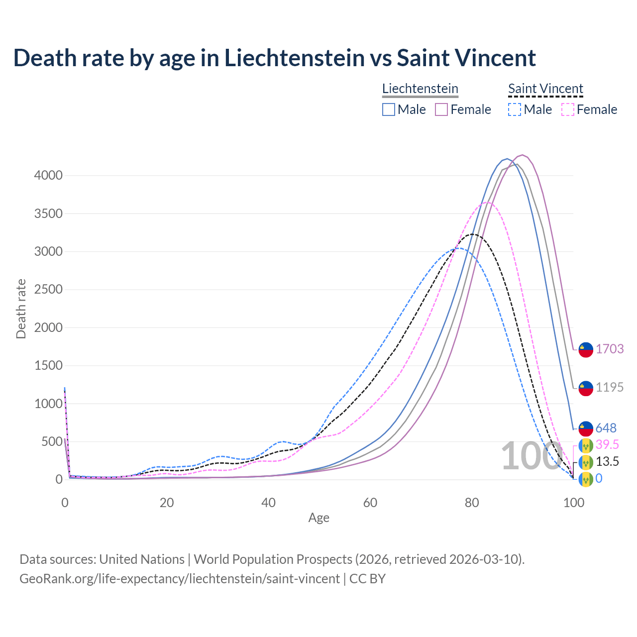 In Liechtenstein, the most common age of death is 89, compared to 80 in Saint Vincent. The median age of death is 86.3 in Liechtenstein and 75.6 in Saint Vincent, meaning only half of each cohort is expected to live past that age.
