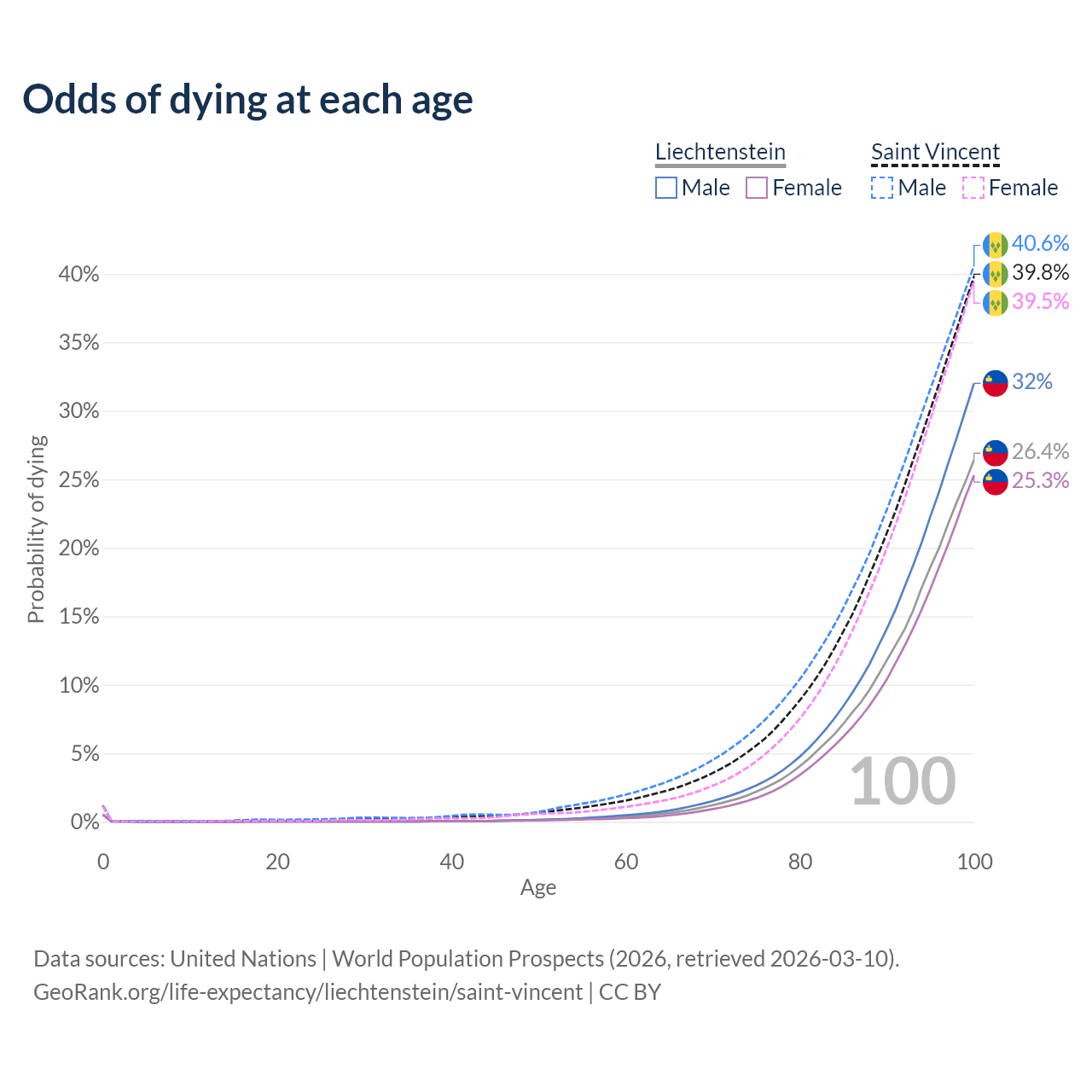 This life expectancy calculator shows the odds of living to 100, 95, 90, and below based on current age for both males and females in Liechtenstein and Saint Vincent, along with mean and median age of death. The calculations are based on the 2026 life tables (actuarial tables) from the UN World Population Prospects.