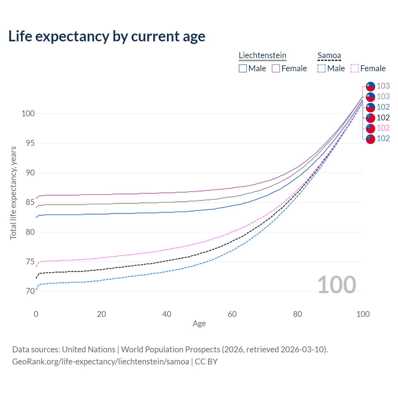 This life expectancy calculator shows the odds of living to 100, 95, 90, and below based on current age for both males and females in Liechtenstein and Samoa, along with mean and median age of death. The calculations are based on the 2026 life tables (actuarial tables) from the UN World Population Prospects.
