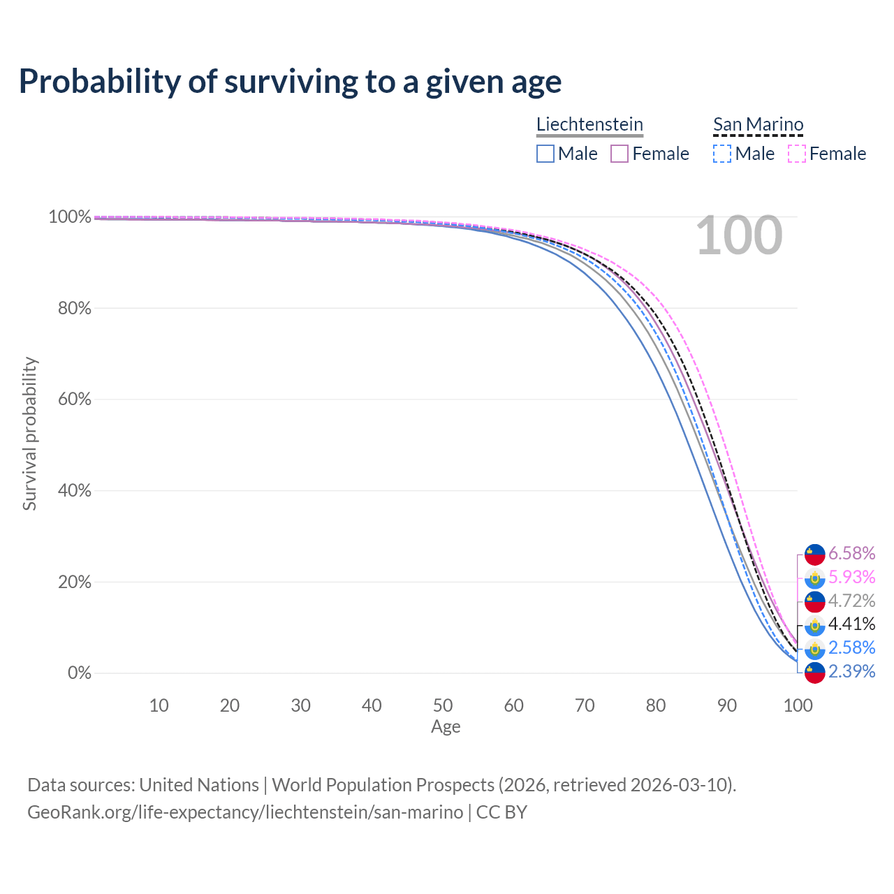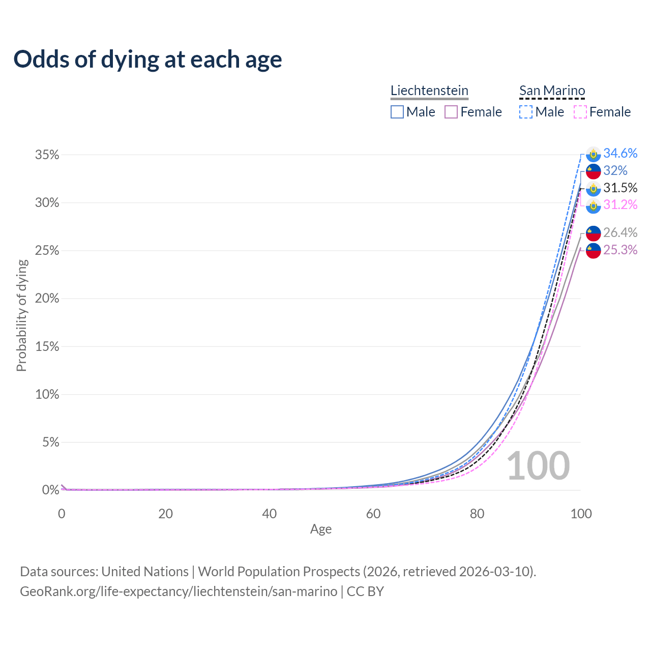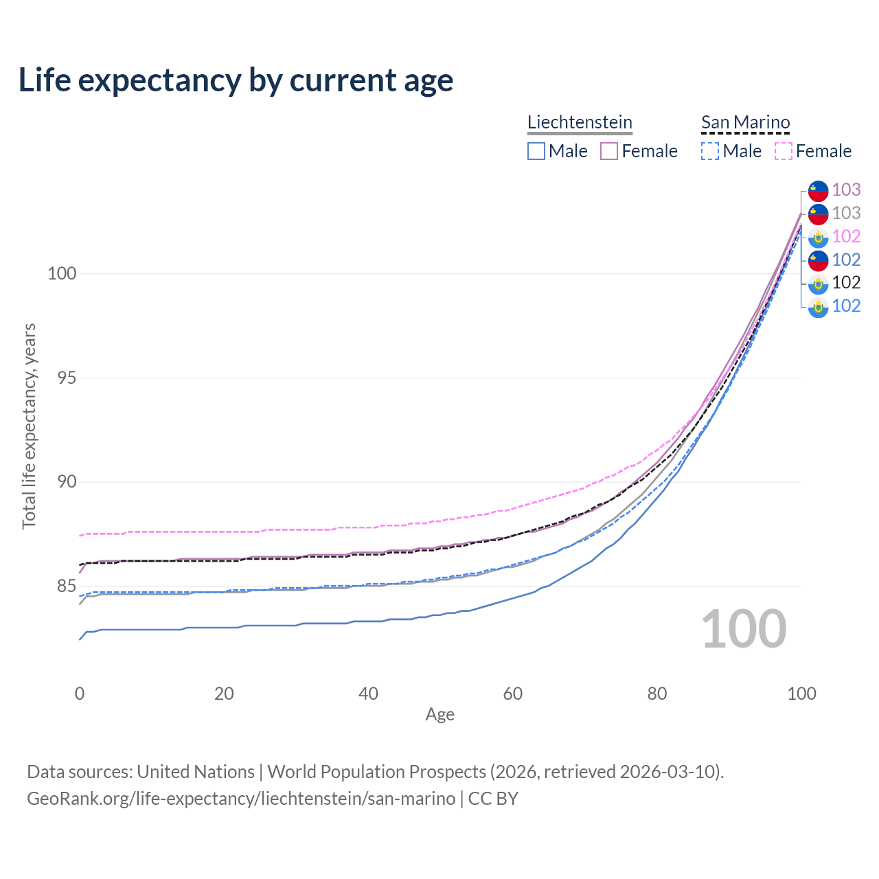 This life expectancy calculator shows the odds of living to 100, 95, 90, and below based on current age for both males and females in Liechtenstein and San Marino, along with mean and median age of death. The calculations are based on the 2026 life tables (actuarial tables) from the UN World Population Prospects.