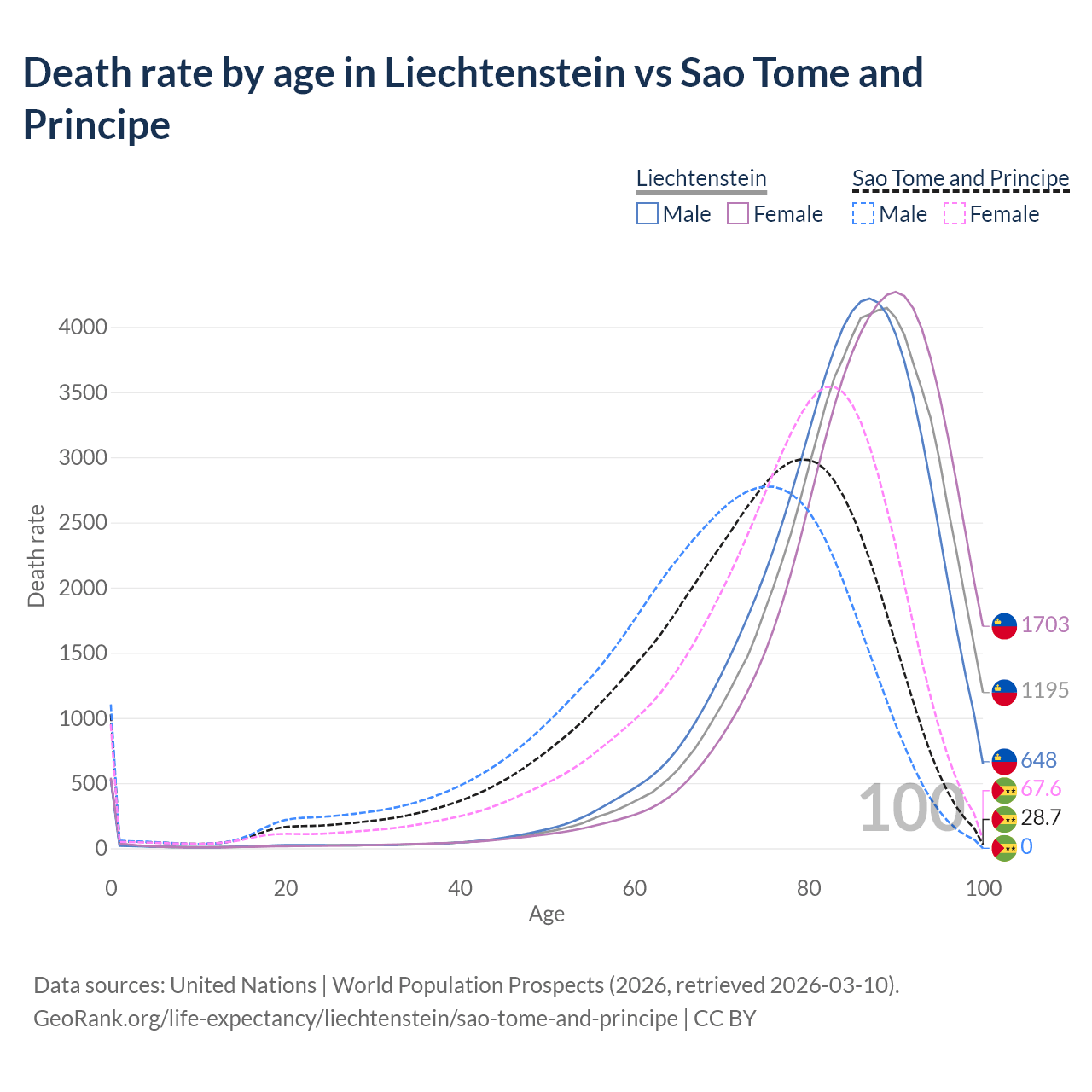 In Liechtenstein, the most common age of death is 89, compared to 79 in Sao Tome and Principe. The median age of death is 86.3 in Liechtenstein and 74.1 in Sao Tome and Principe, meaning only half of each cohort is expected to live past that age.
