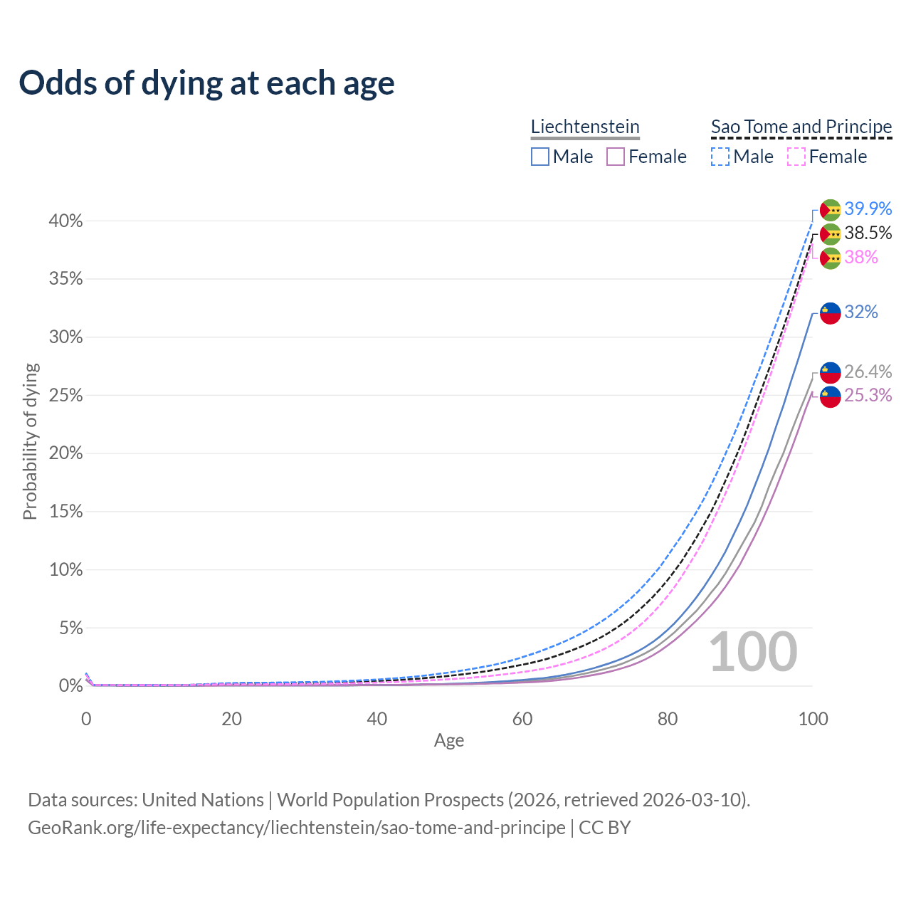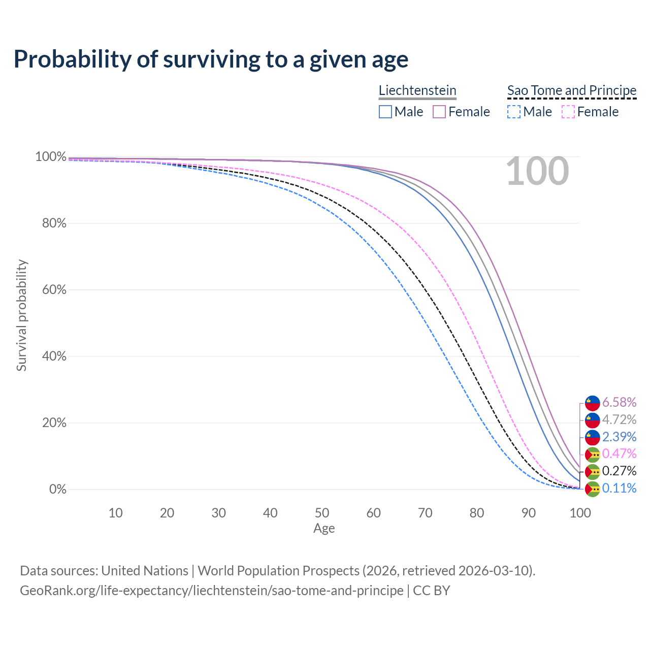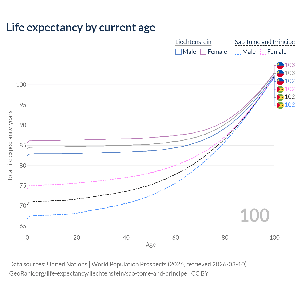 This life expectancy calculator shows the odds of living to 100, 95, 90, and below based on current age for both males and females in Liechtenstein and Sao Tome and Principe, along with mean and median age of death. The calculations are based on the 2026 life tables (actuarial tables) from the UN World Population Prospects.
