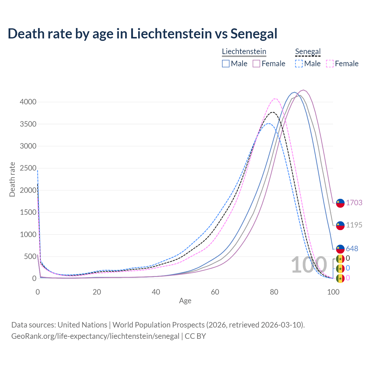 In Liechtenstein, the most common age of death is 89, compared to 80 in Senegal. The median age of death is 86.3 in Liechtenstein and 75 in Senegal, meaning only half of each cohort is expected to live past that age.