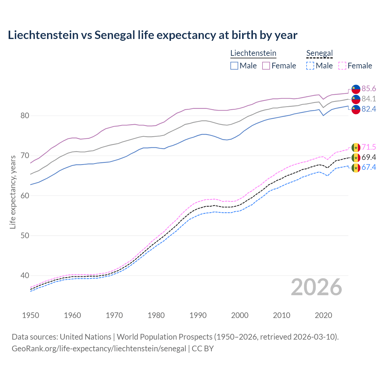 The average life expectancy at birth is 84.1 years in Liechtenstein vs 69.4 in Senegal. Liechtenstein is ranked 11/197 by life expectancy, and Senegal is 143/197. In Liechtenstein, the life expectancy is 82.4 years for males and 85.6 years for females. In Senegal, it's 67.4 years for males and 71.5 years for females.