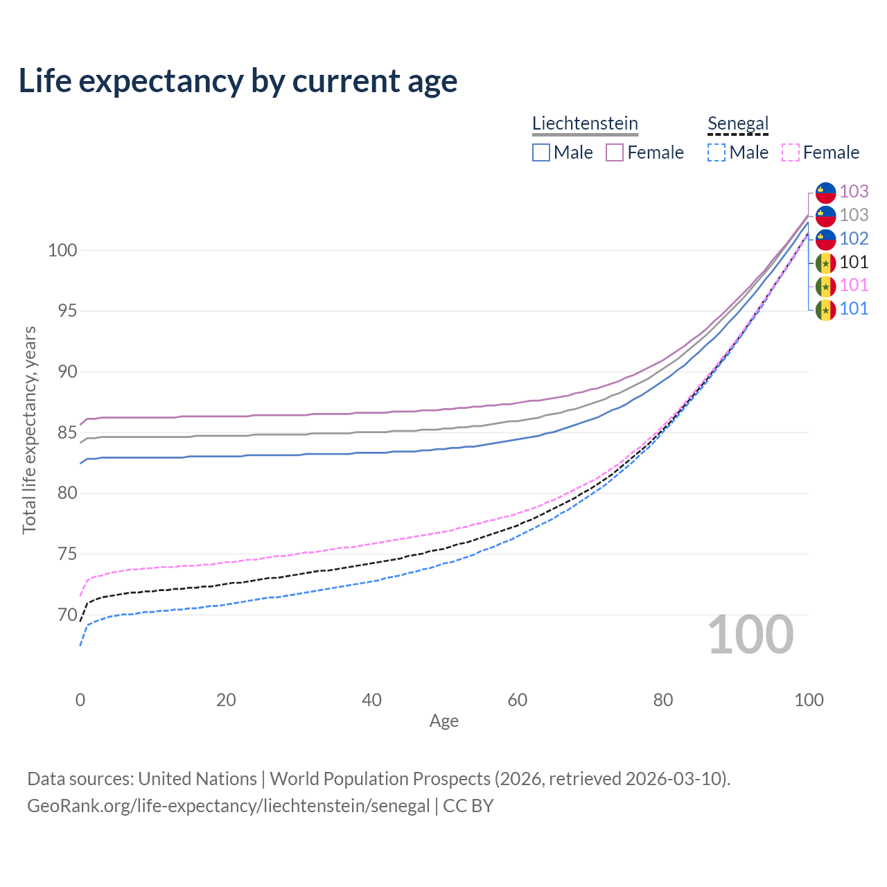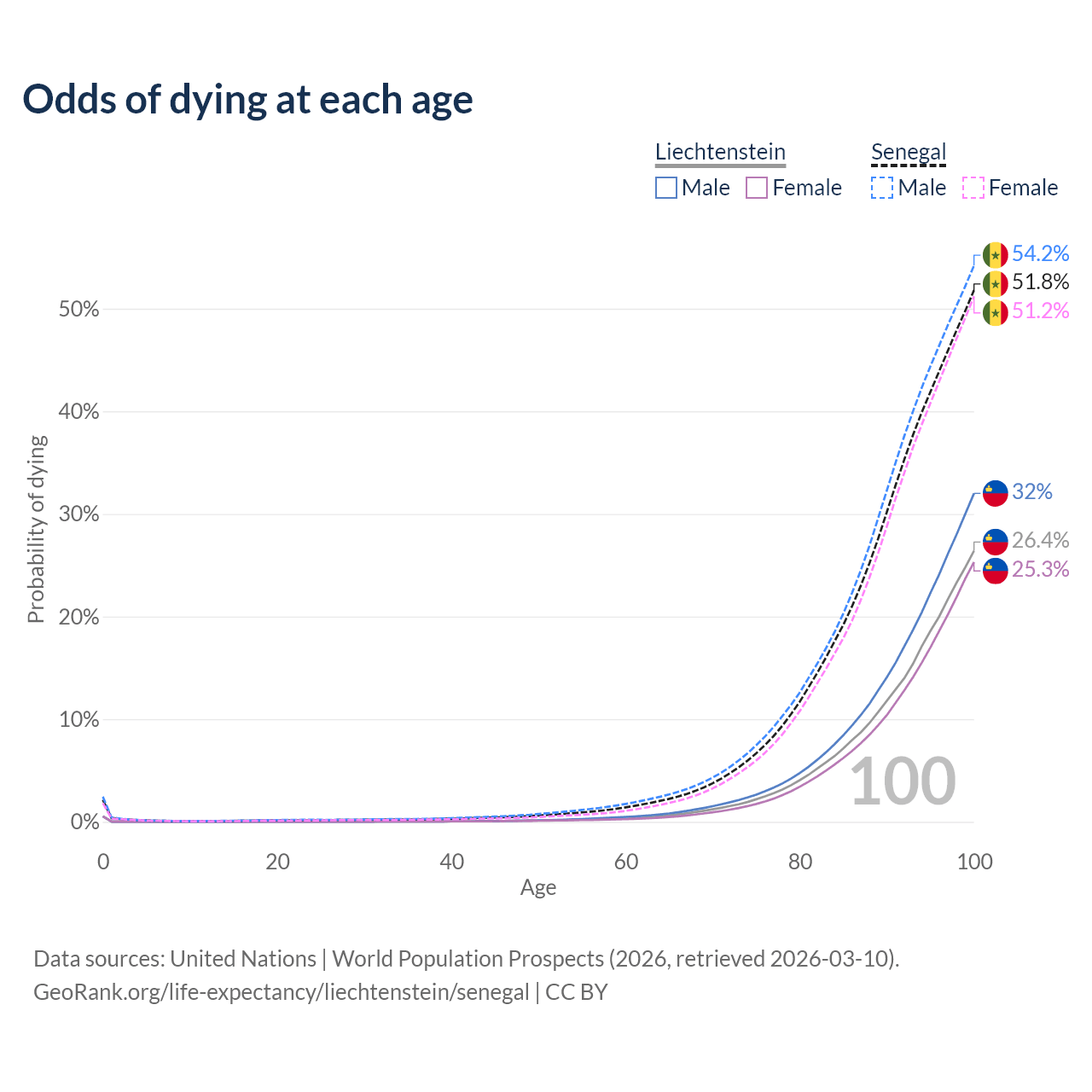 This life expectancy calculator shows the odds of living to 100, 95, 90, and below based on current age for both males and females in Liechtenstein and Senegal, along with mean and median age of death. The calculations are based on the 2026 life tables (actuarial tables) from the UN World Population Prospects.