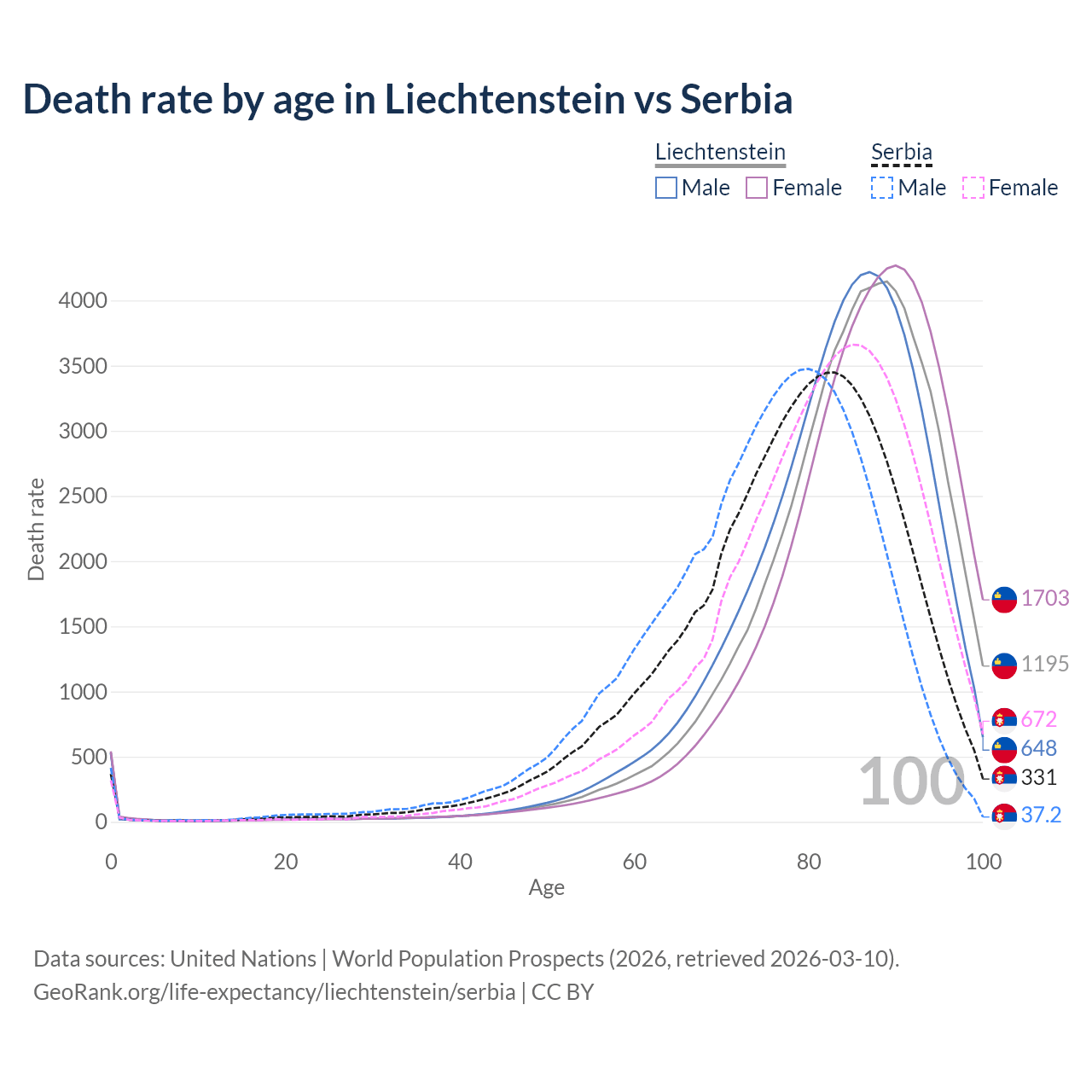 This life expectancy calculator shows the odds of living to 100, 95, 90, and below based on current age for both males and females in Liechtenstein and Serbia, along with mean and median age of death. The calculations are based on the 2026 life tables (actuarial tables) from the UN World Population Prospects.