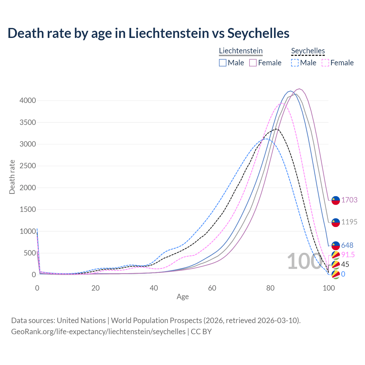 In Liechtenstein, the most common age of death is 89, compared to 82 in the Seychelles. The median age of death is 86.3 in Liechtenstein and 77 in the Seychelles, meaning only half of each cohort is expected to live past that age.