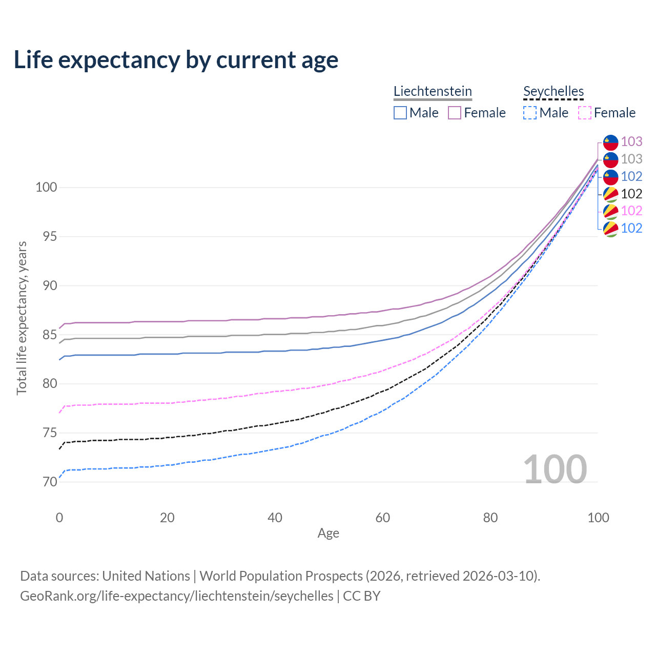 This life expectancy calculator shows the odds of living to 100, 95, 90, and below based on current age for both males and females in Liechtenstein and the Seychelles, along with mean and median age of death. The calculations are based on the 2026 life tables (actuarial tables) from the UN World Population Prospects.