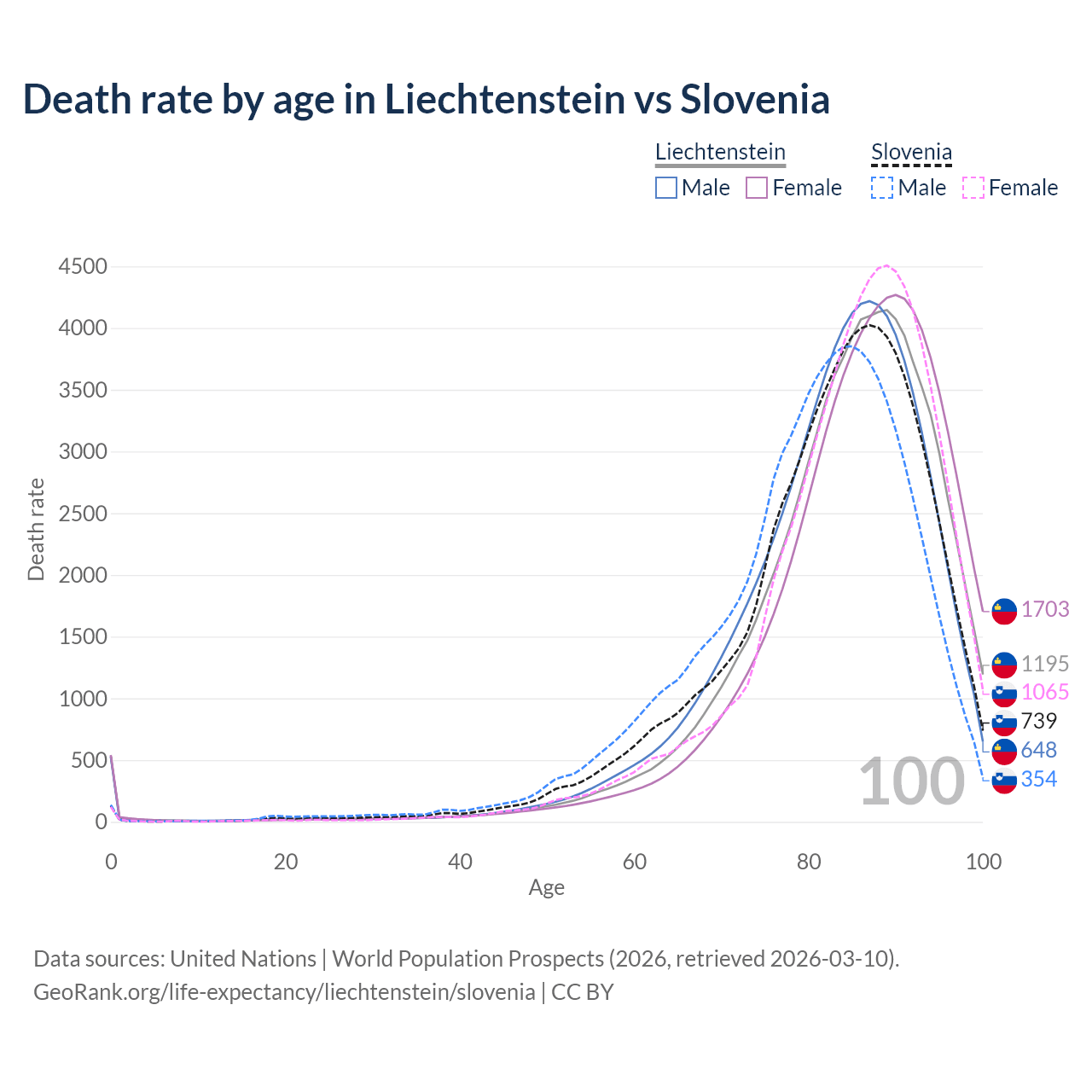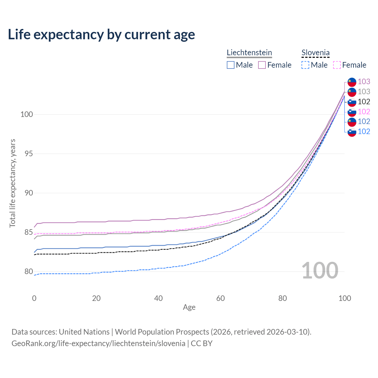 This life expectancy calculator shows the odds of living to 100, 95, 90, and below based on current age for both males and females in Liechtenstein and Slovenia, along with mean and median age of death. The calculations are based on the 2026 life tables (actuarial tables) from the UN World Population Prospects.