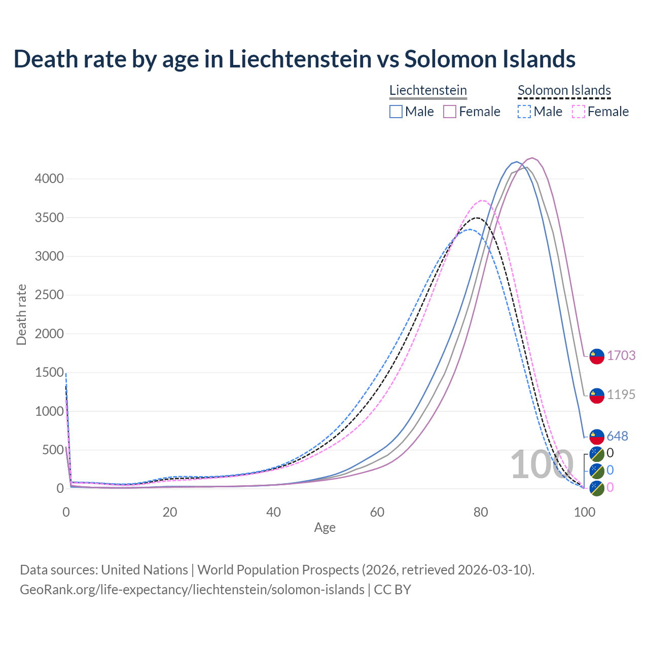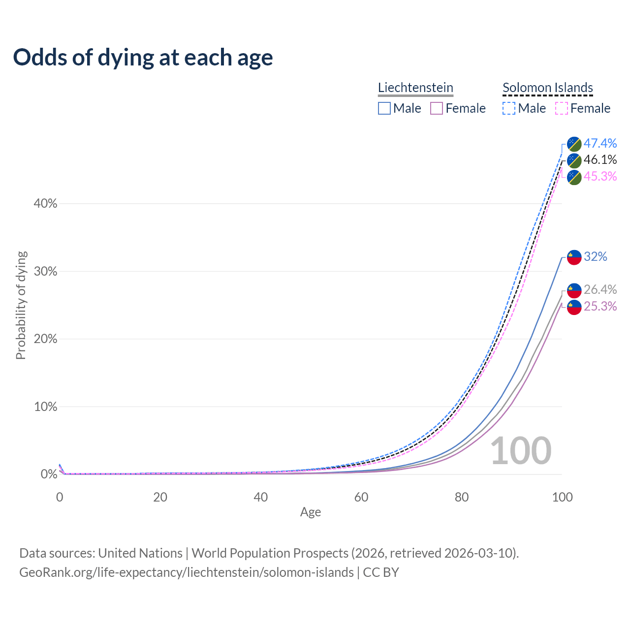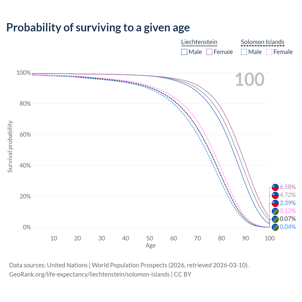 This life expectancy calculator shows the odds of living to 100, 95, 90, and below based on current age for both males and females in Liechtenstein and the Solomon Islands, along with mean and median age of death. The calculations are based on the 2026 life tables (actuarial tables) from the UN World Population Prospects.