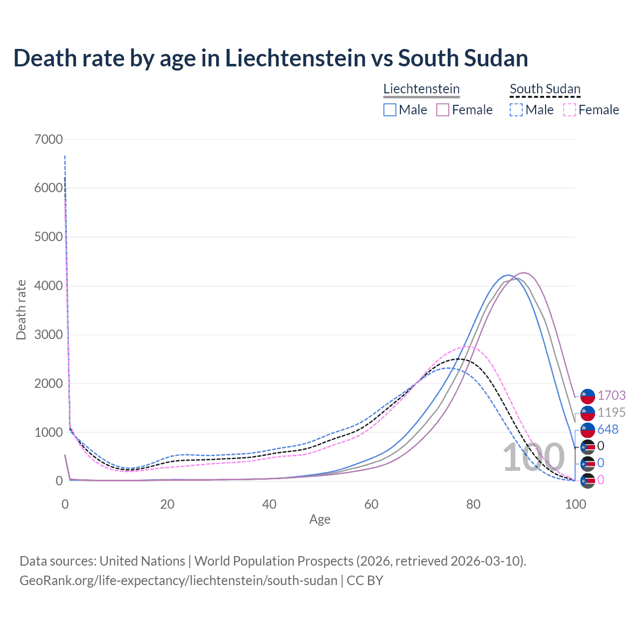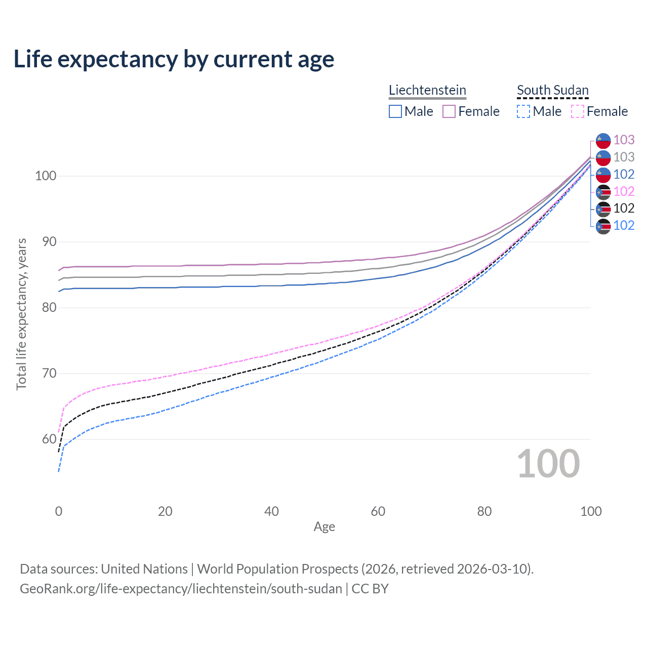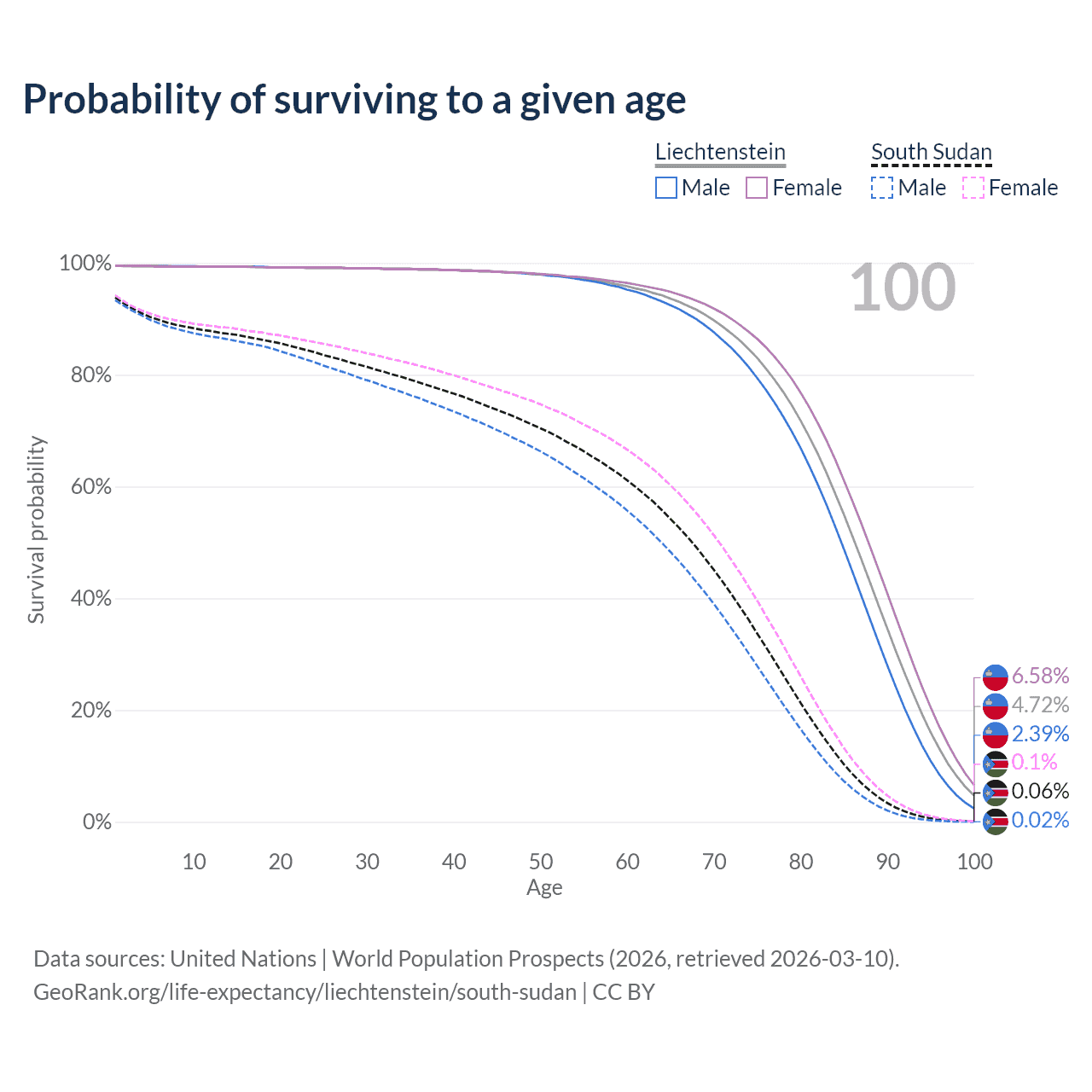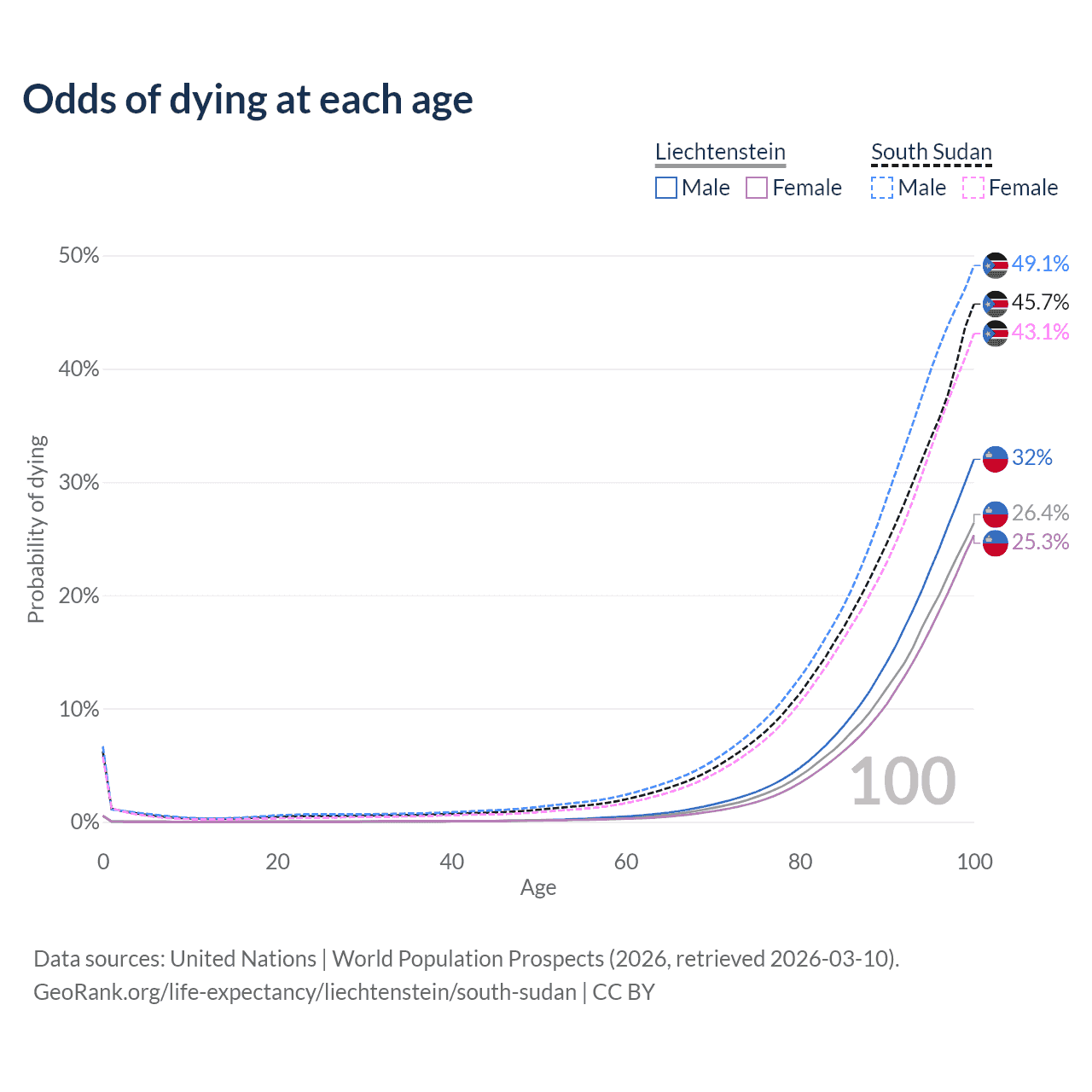 This life expectancy calculator shows the odds of living to 100, 95, 90, and below based on current age for both males and females in Liechtenstein and South Sudan, along with mean and median age of death. The calculations are based on the 2026 life tables (actuarial tables) from the UN World Population Prospects.