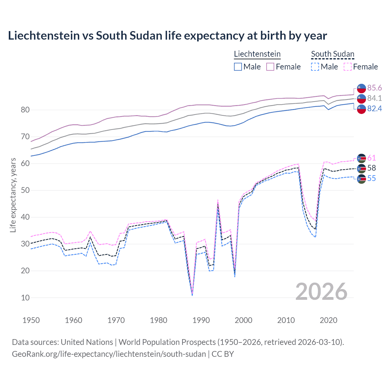 The average life expectancy at birth is 84.1 years in Liechtenstein vs 58 in South Sudan. Liechtenstein is ranked 11/197 by life expectancy, and South Sudan is 195/197. In Liechtenstein, the life expectancy is 82.4 years for males and 85.6 years for females. In South Sudan, it's 55 years for males and 61 years for females.