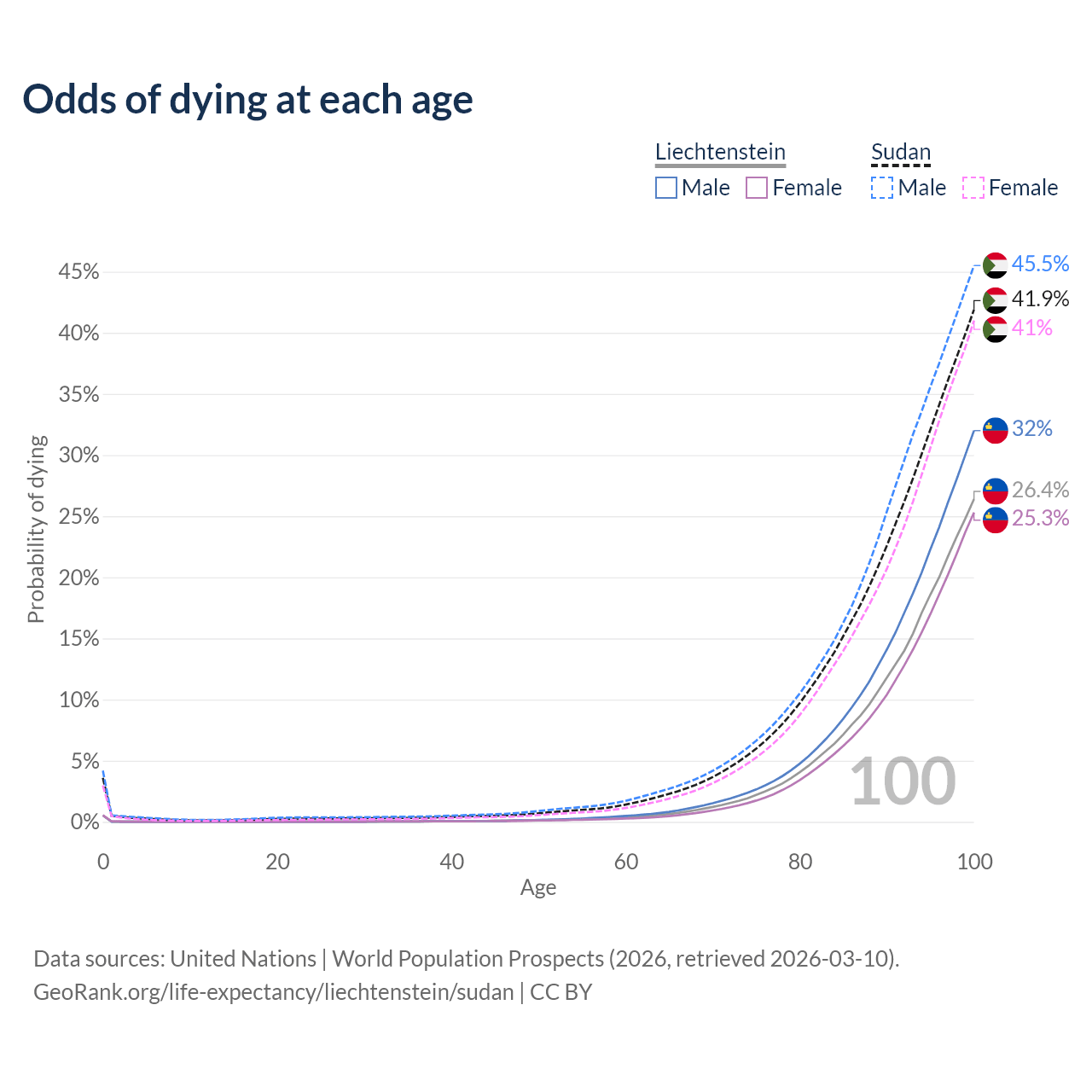 This life expectancy calculator shows the odds of living to 100, 95, 90, and below based on current age for both males and females in Liechtenstein and Sudan, along with mean and median age of death. The calculations are based on the 2026 life tables (actuarial tables) from the UN World Population Prospects.