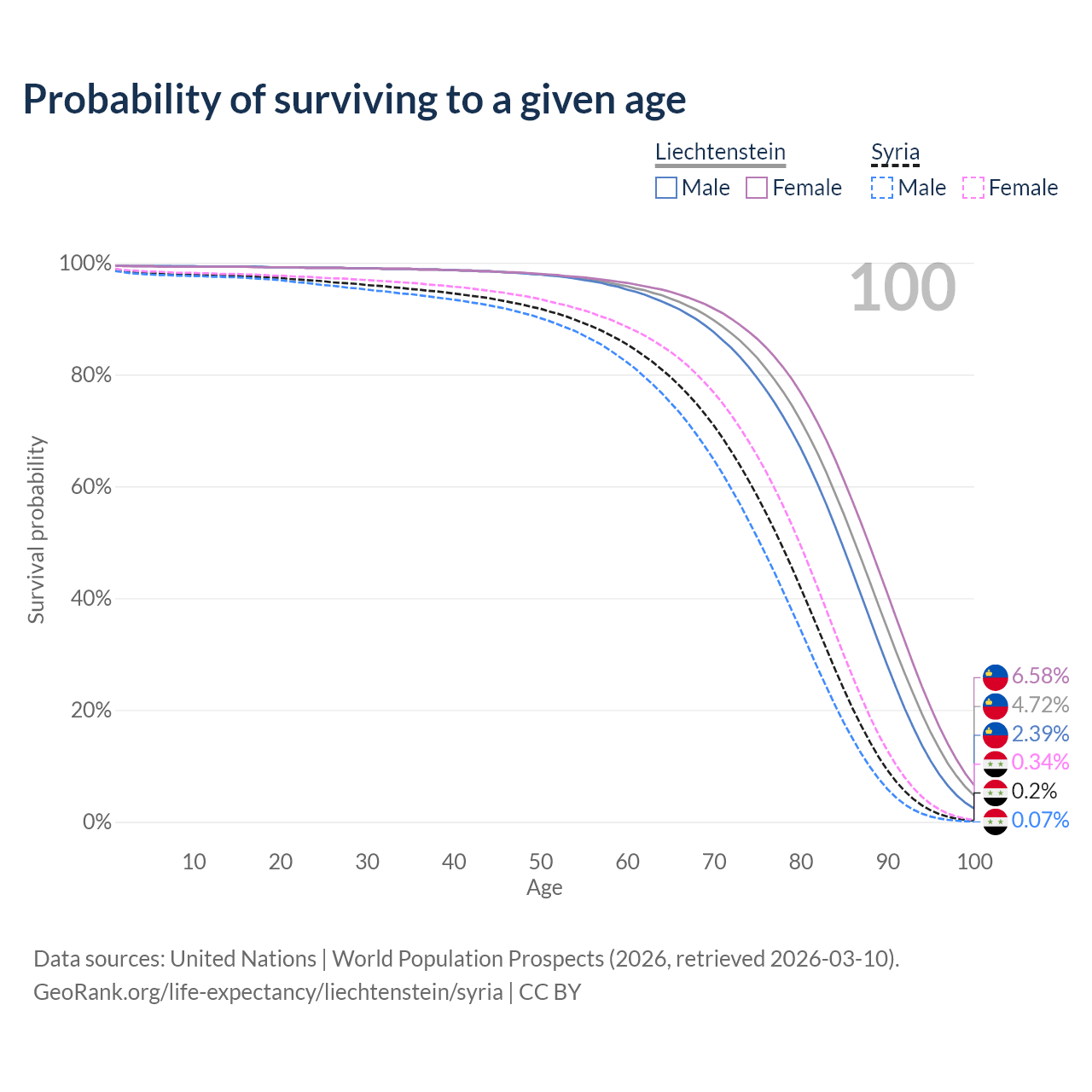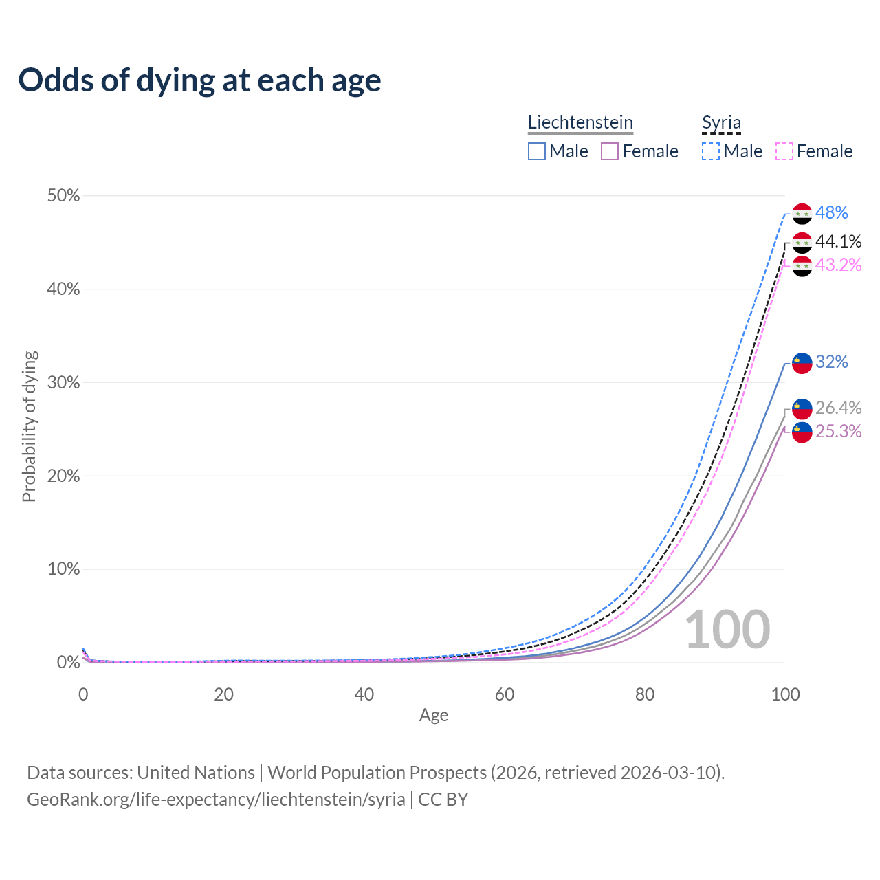 This life expectancy calculator shows the odds of living to 100, 95, 90, and below based on current age for both males and females in Liechtenstein and Syria, along with mean and median age of death. The calculations are based on the 2026 life tables (actuarial tables) from the UN World Population Prospects.