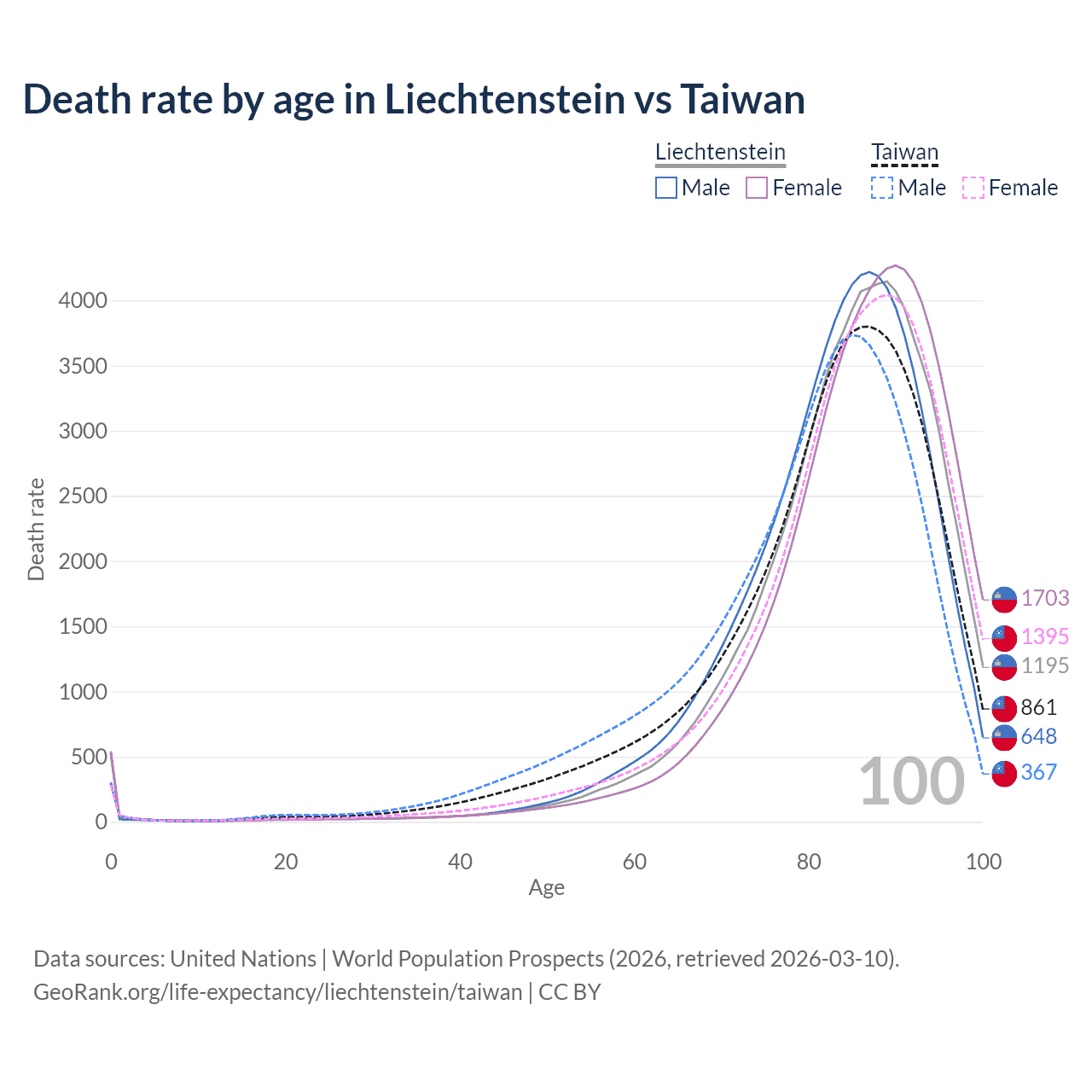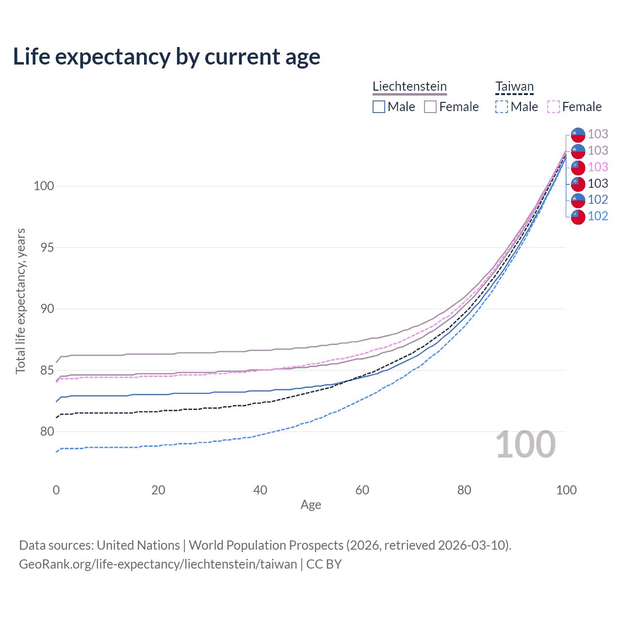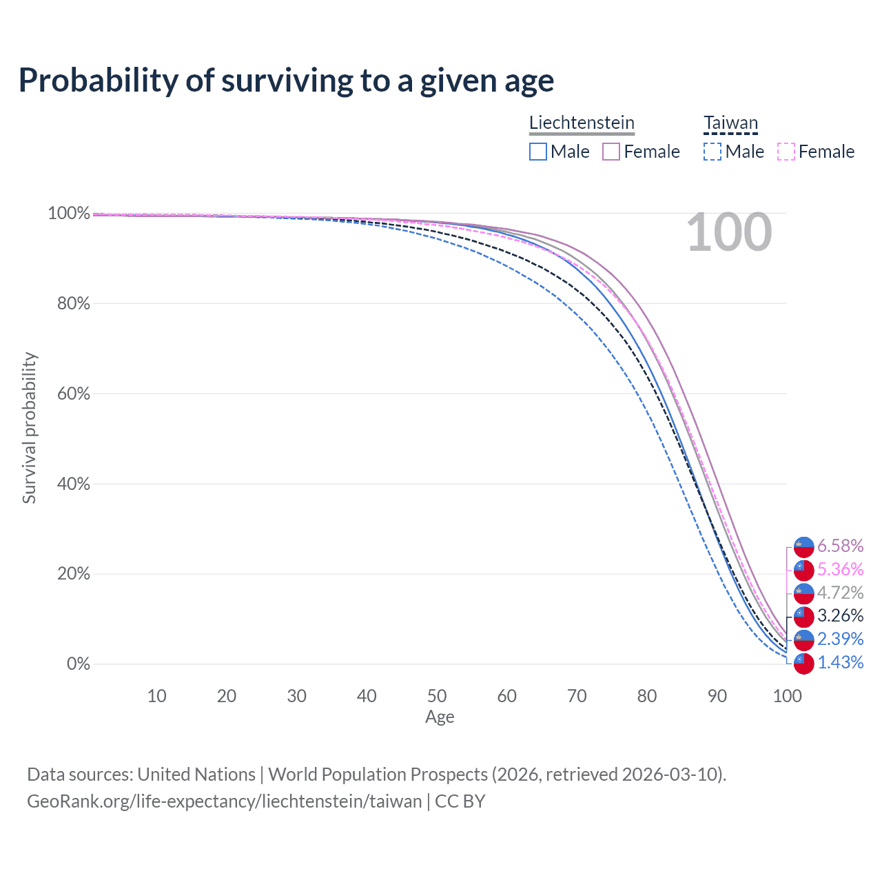 This life expectancy calculator shows the odds of living to 100, 95, 90, and below based on current age for both males and females in Liechtenstein and Taiwan, along with mean and median age of death. The calculations are based on the 2026 life tables (actuarial tables) from the UN World Population Prospects.