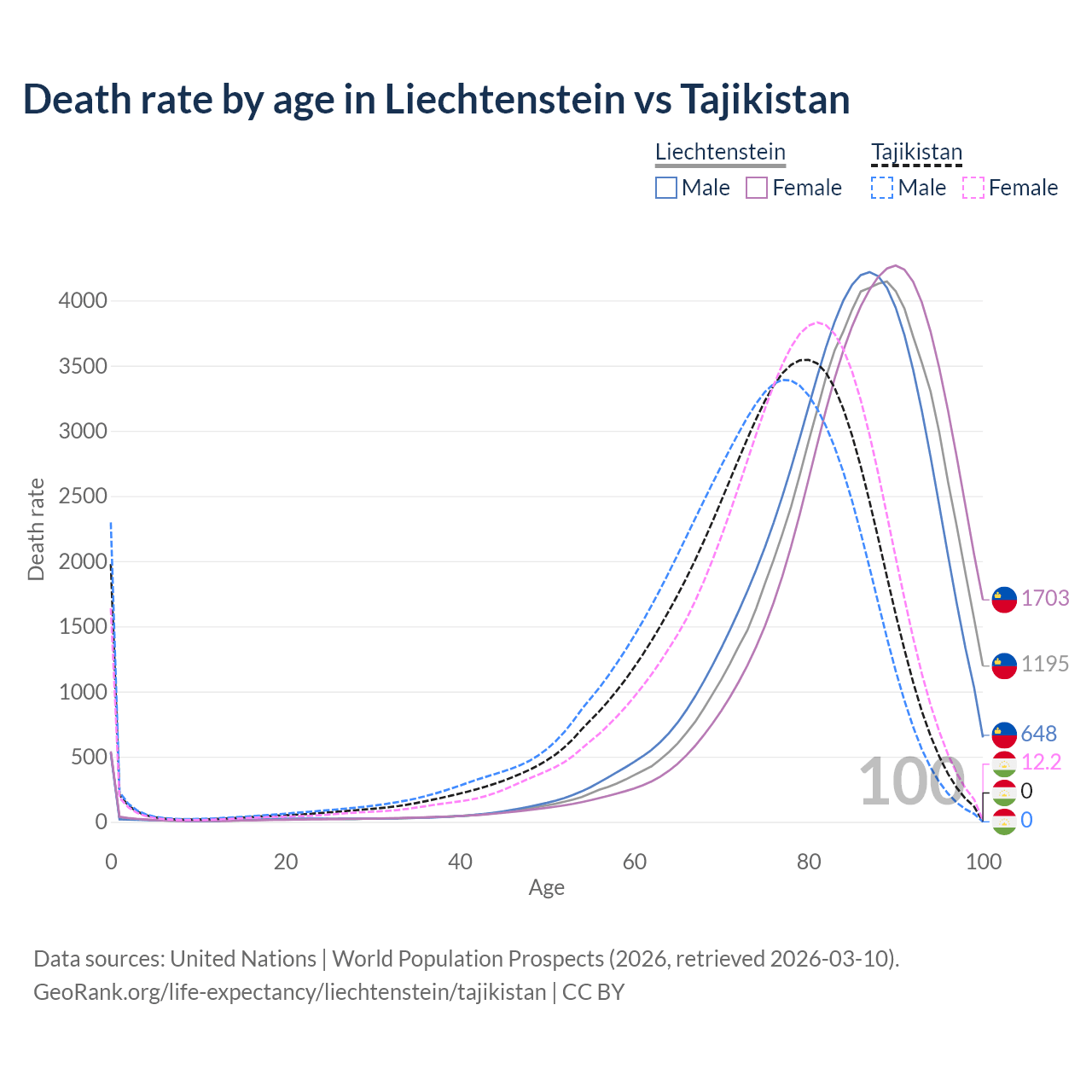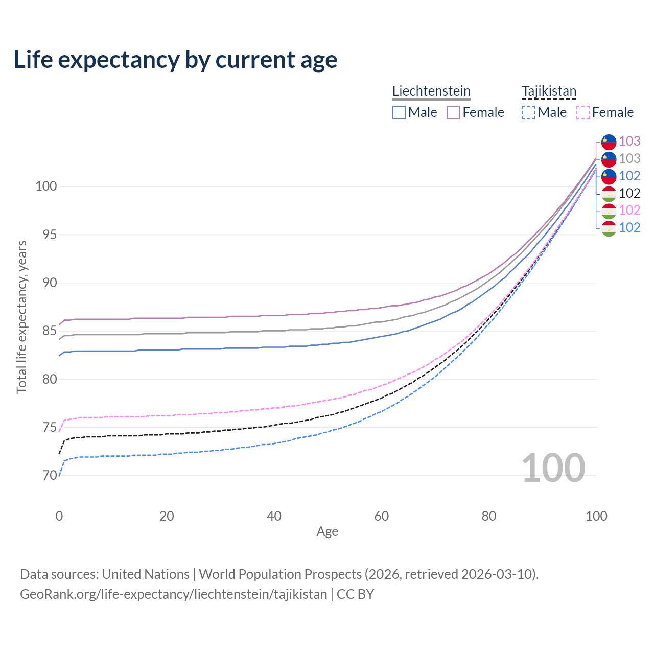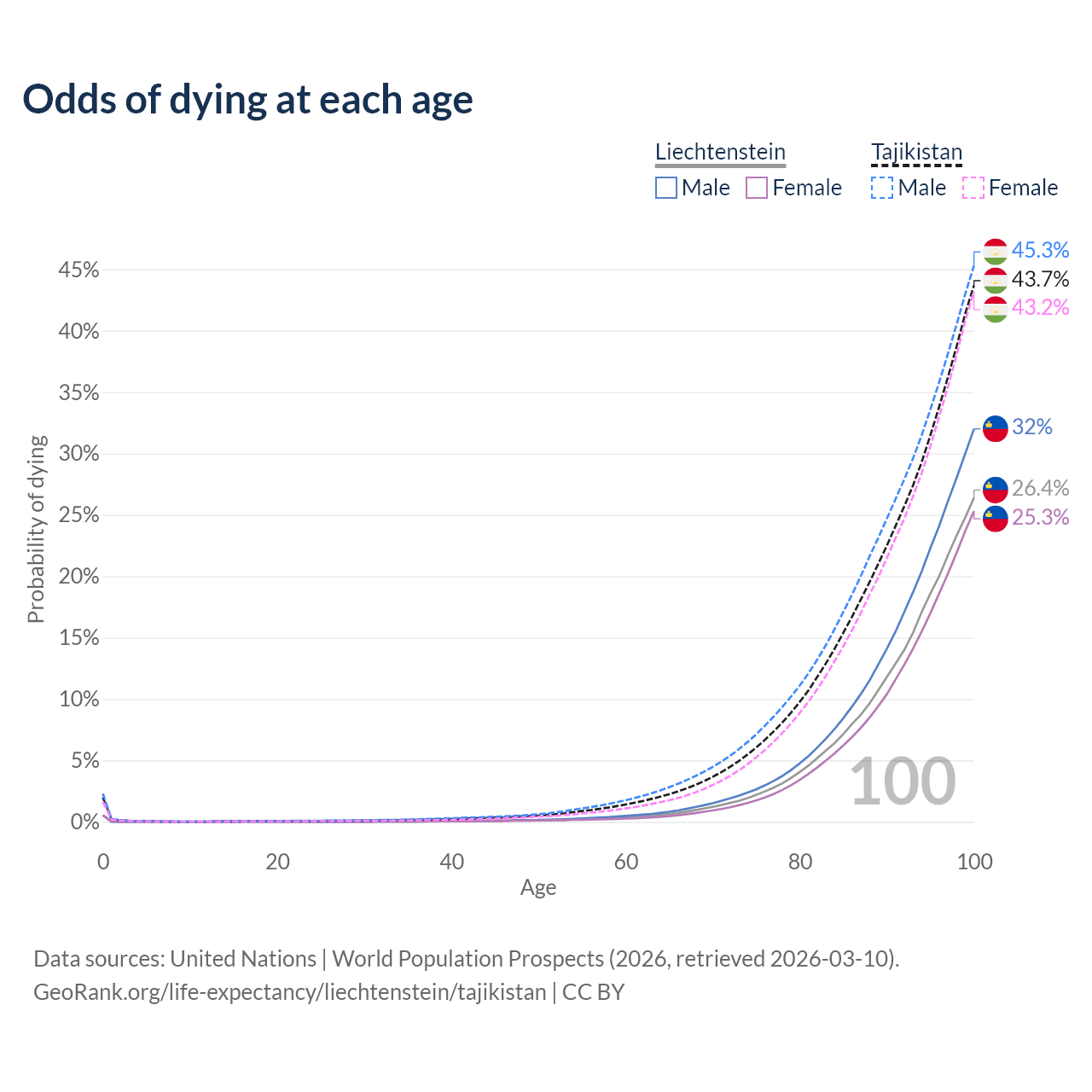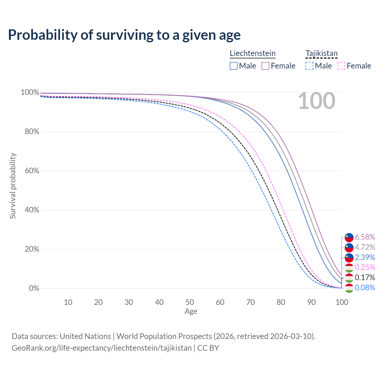 This life expectancy calculator shows the odds of living to 100, 95, 90, and below based on current age for both males and females in Liechtenstein and Tajikistan, along with mean and median age of death. The calculations are based on the 2026 life tables (actuarial tables) from the UN World Population Prospects.