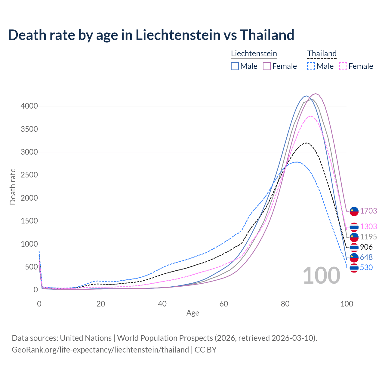 In Liechtenstein, the most common age of death is 89, compared to 87 in Thailand. The median age of death is 86.3 in Liechtenstein and 81.8 in Thailand, meaning only half of each cohort is expected to live past that age.