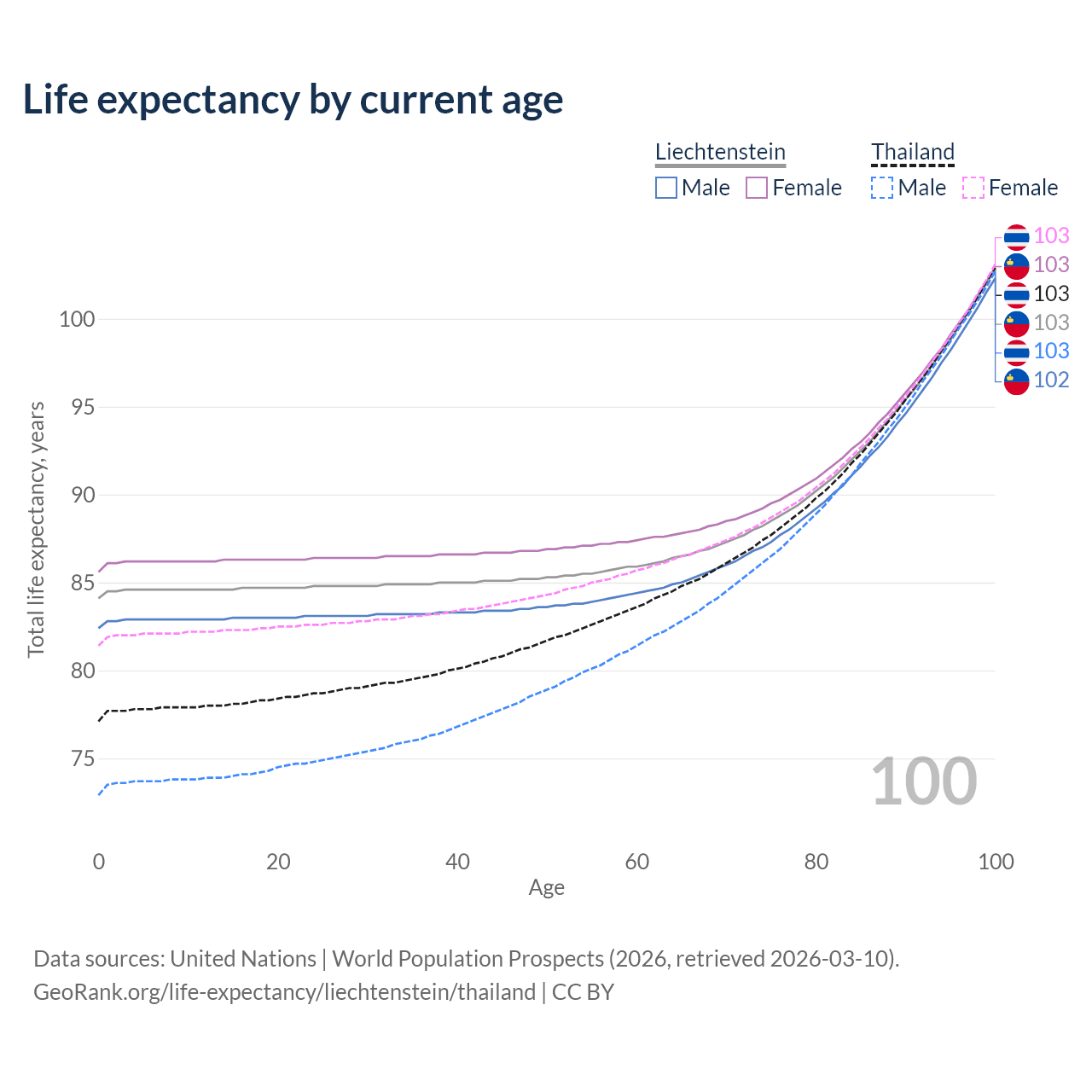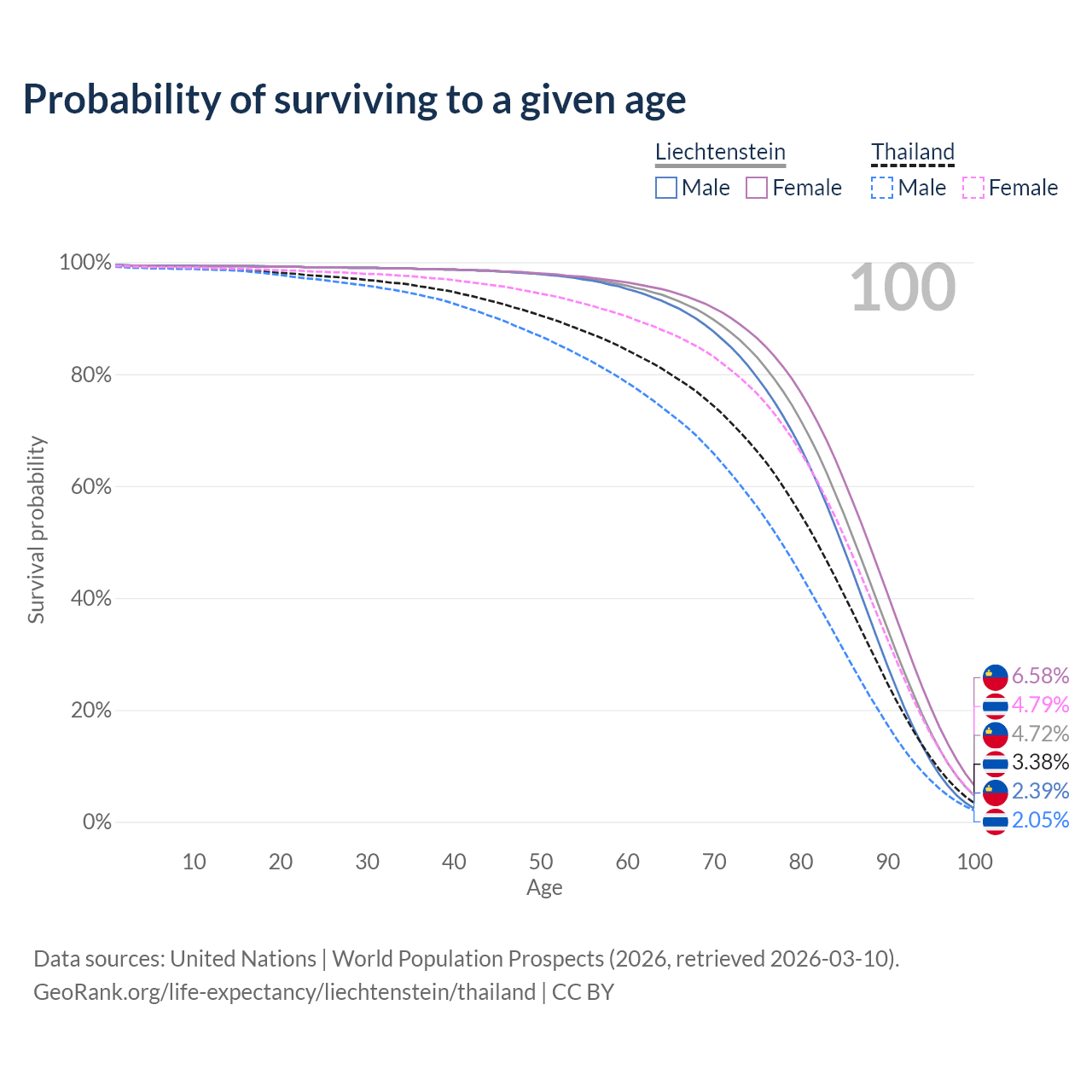 This life expectancy calculator shows the odds of living to 100, 95, 90, and below based on current age for both males and females in Liechtenstein and Thailand, along with mean and median age of death. The calculations are based on the 2026 life tables (actuarial tables) from the UN World Population Prospects.