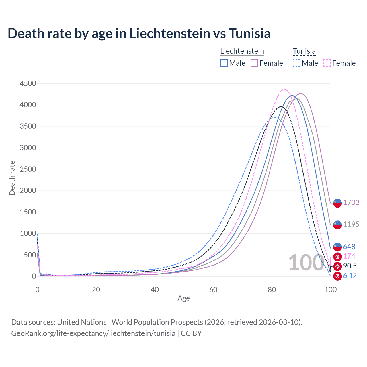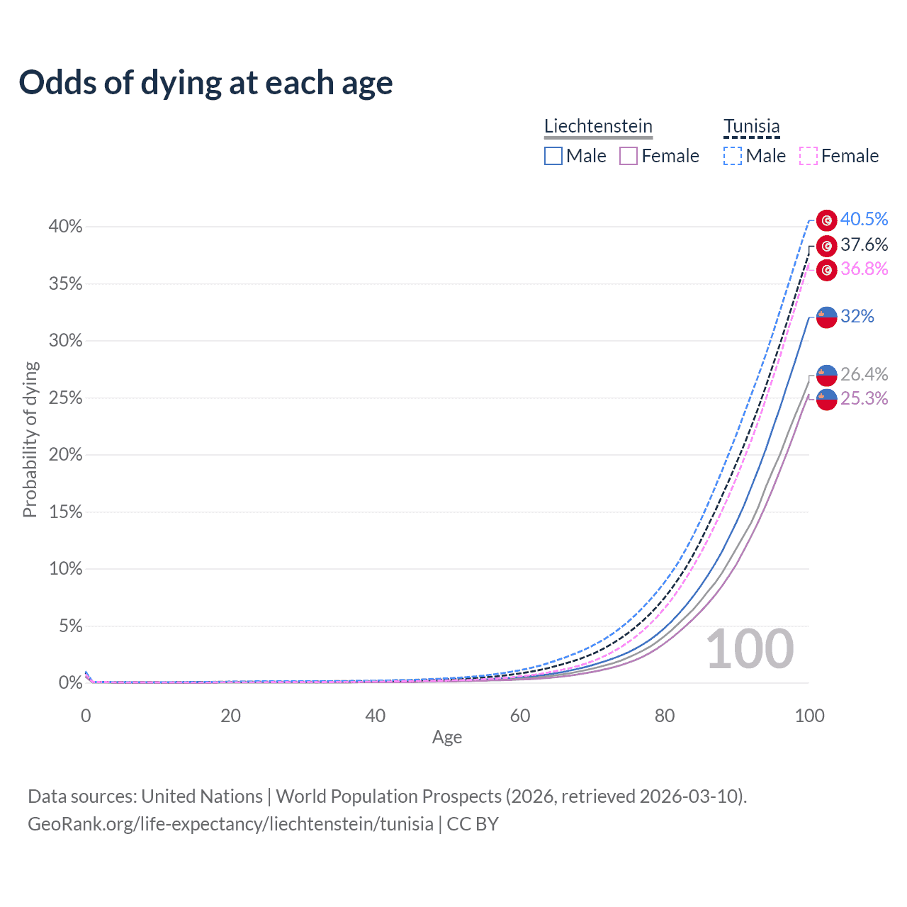This life expectancy calculator shows the odds of living to 100, 95, 90, and below based on current age for both males and females in Liechtenstein and Tunisia, along with mean and median age of death. The calculations are based on the 2026 life tables (actuarial tables) from the UN World Population Prospects.