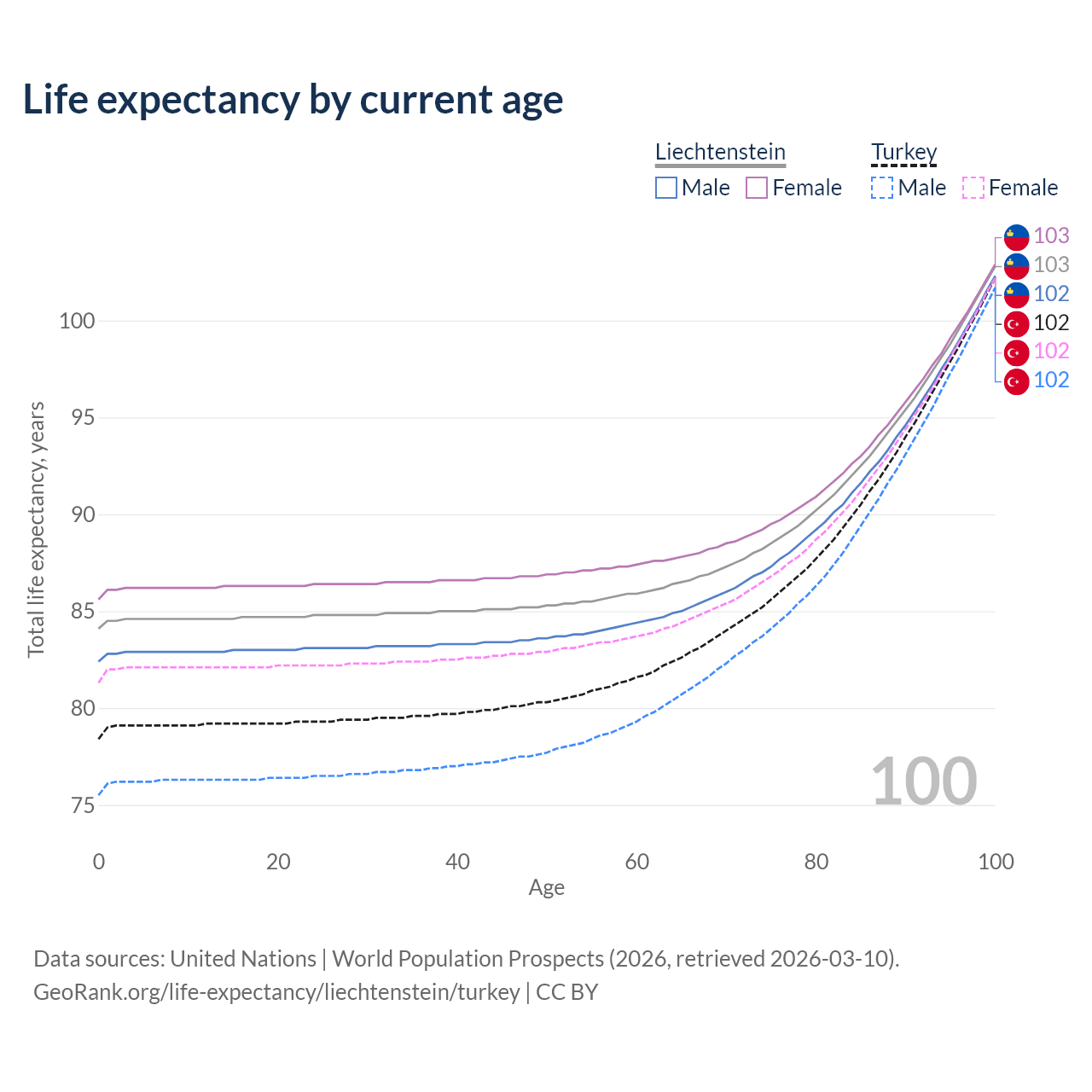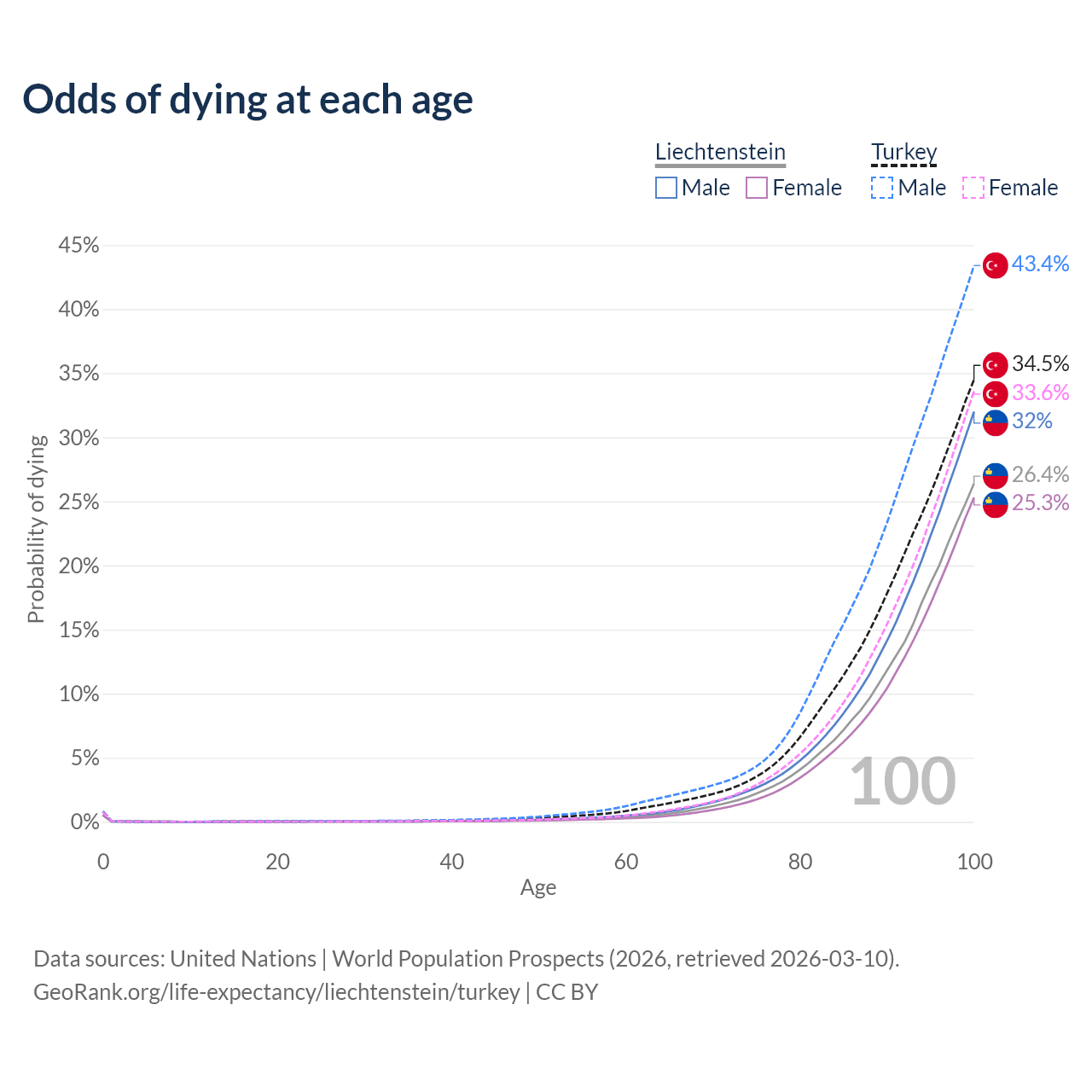 This life expectancy calculator shows the odds of living to 100, 95, 90, and below based on current age for both males and females in Liechtenstein and Turkey, along with mean and median age of death. The calculations are based on the 2026 life tables (actuarial tables) from the UN World Population Prospects.