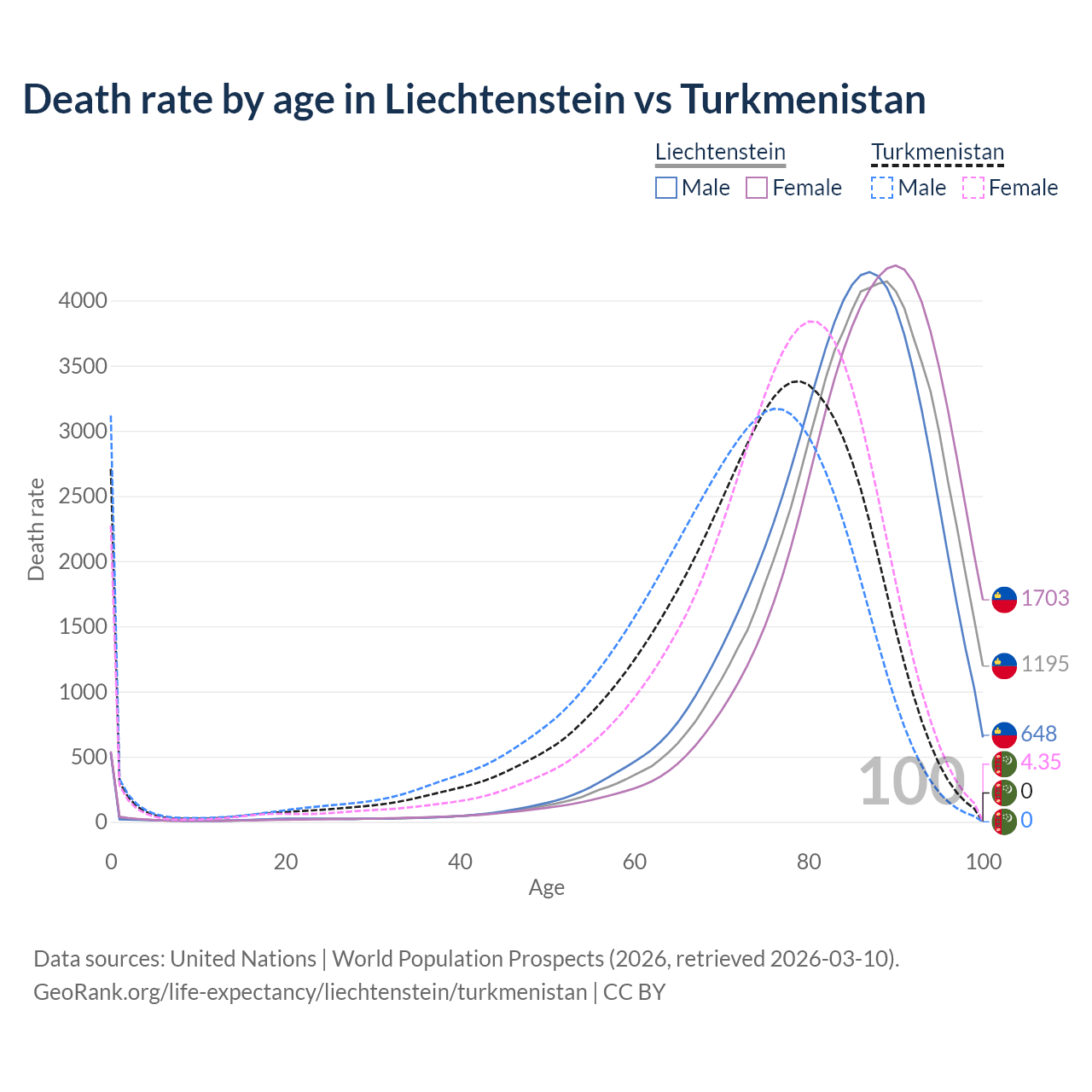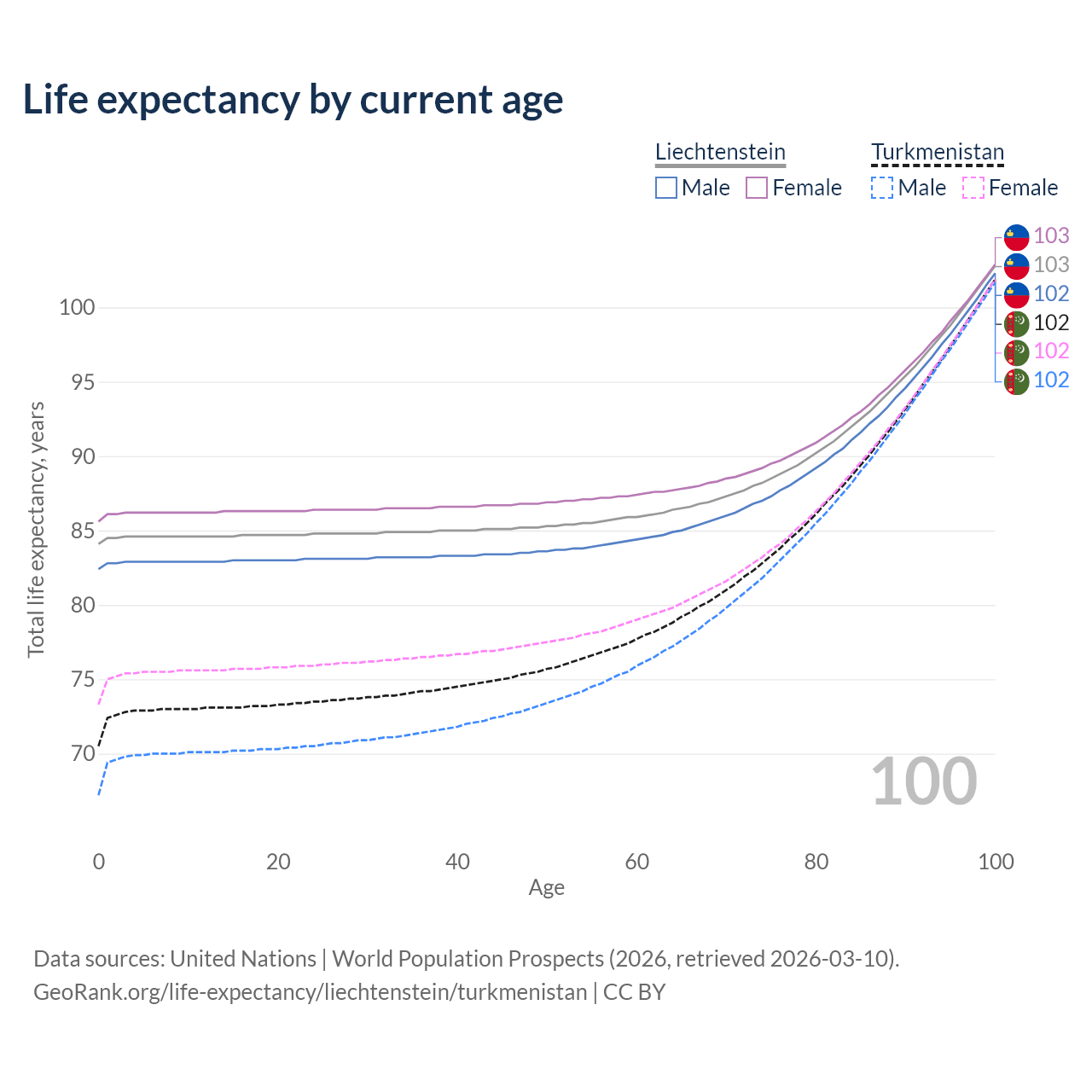 This life expectancy calculator shows the odds of living to 100, 95, 90, and below based on current age for both males and females in Liechtenstein and Turkmenistan, along with mean and median age of death. The calculations are based on the 2026 life tables (actuarial tables) from the UN World Population Prospects.