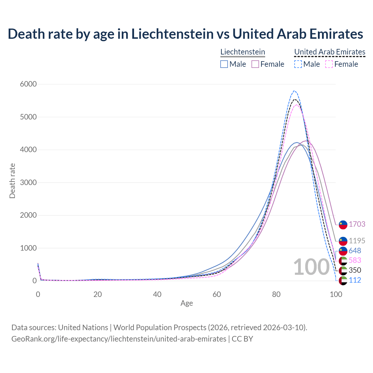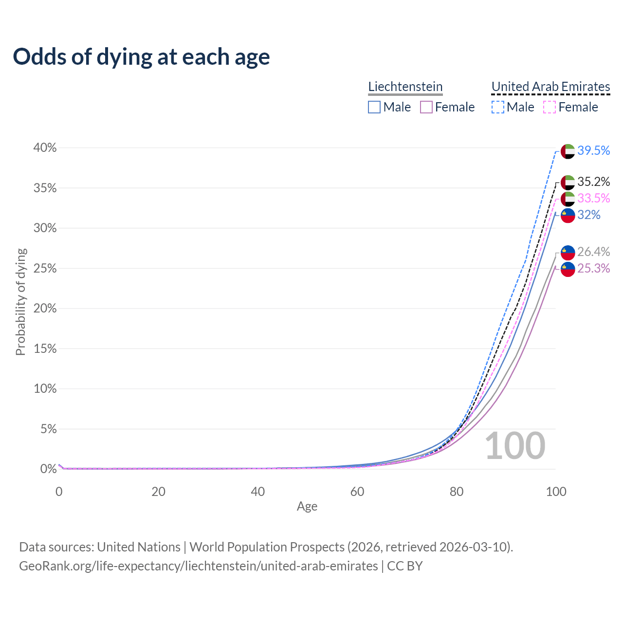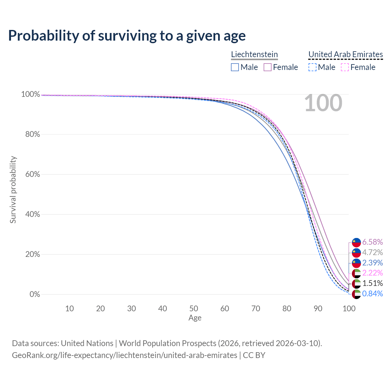 This life expectancy calculator shows the odds of living to 100, 95, 90, and below based on current age for both males and females in Liechtenstein and the United Arab Emirates, along with mean and median age of death. The calculations are based on the 2026 life tables (actuarial tables) from the UN World Population Prospects.
