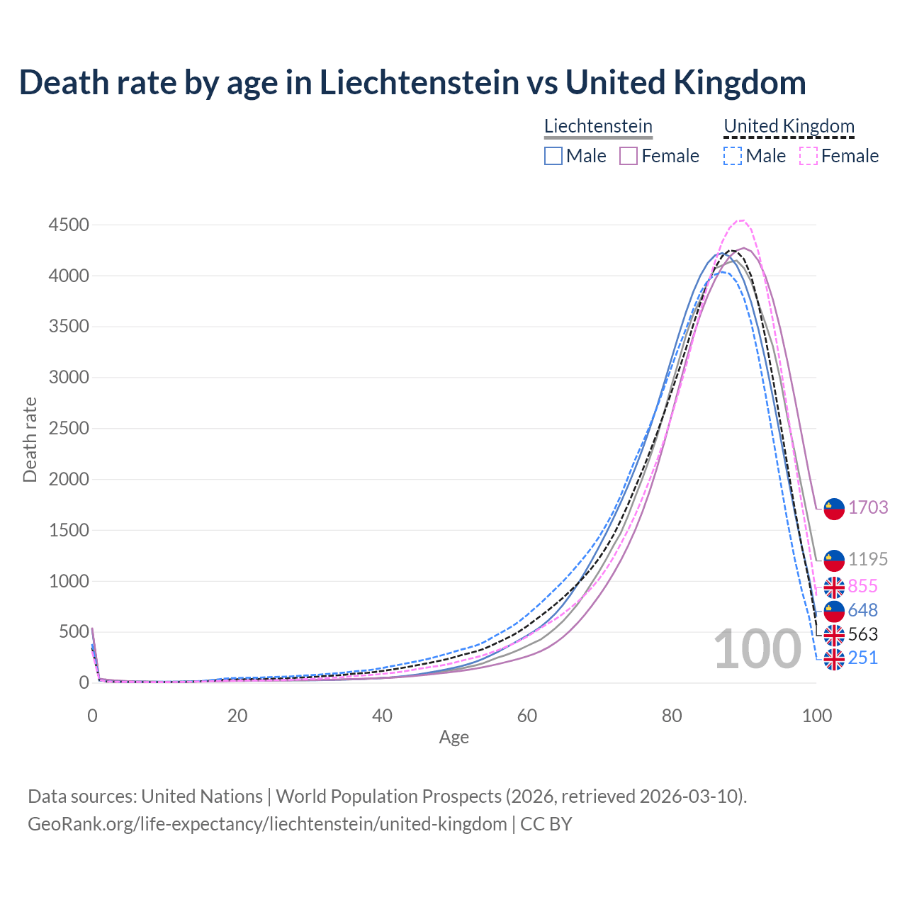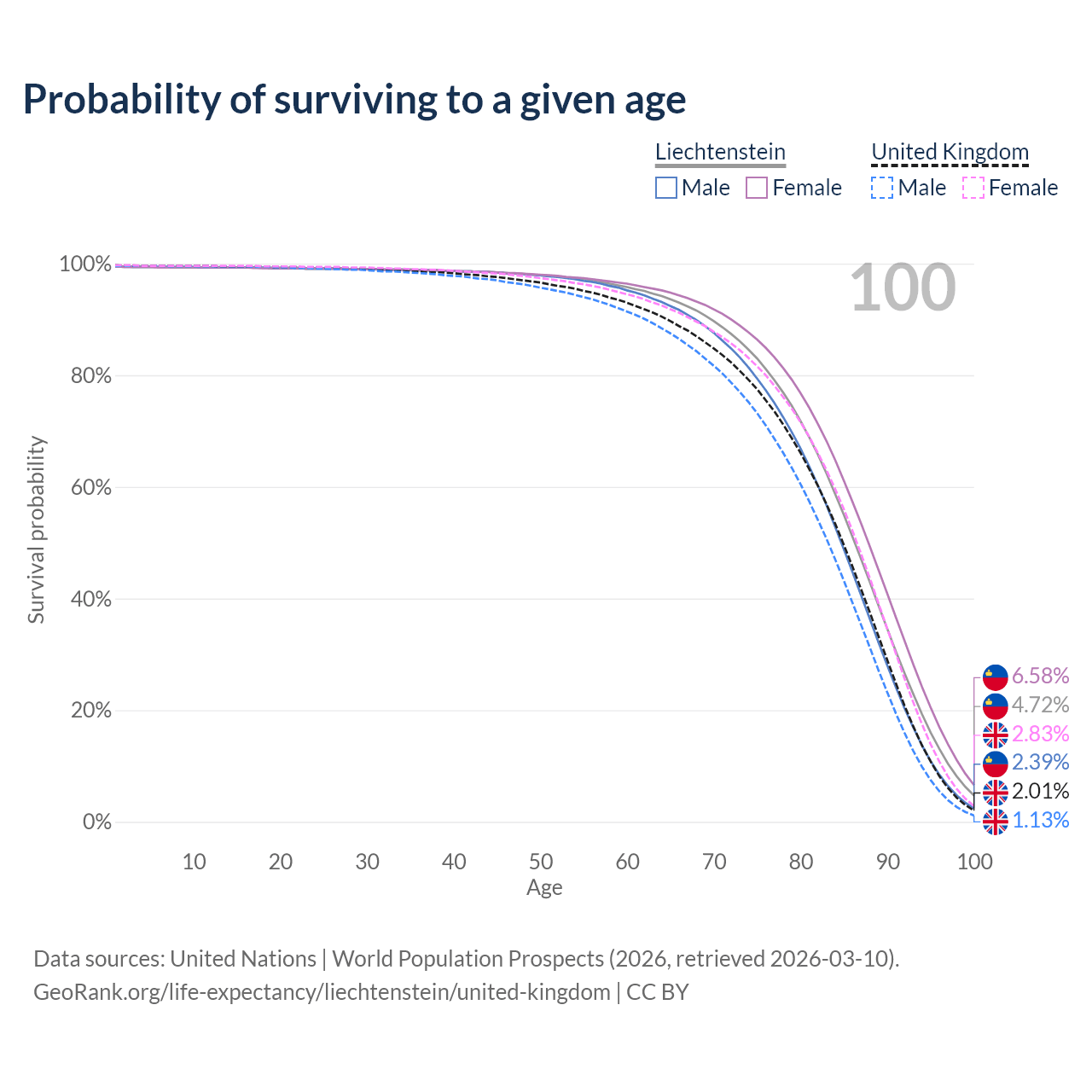 This life expectancy calculator shows the odds of living to 100, 95, 90, and below based on current age for both males and females in Liechtenstein and the United Kingdom, along with mean and median age of death. The calculations are based on the 2026 life tables (actuarial tables) from the UN World Population Prospects.