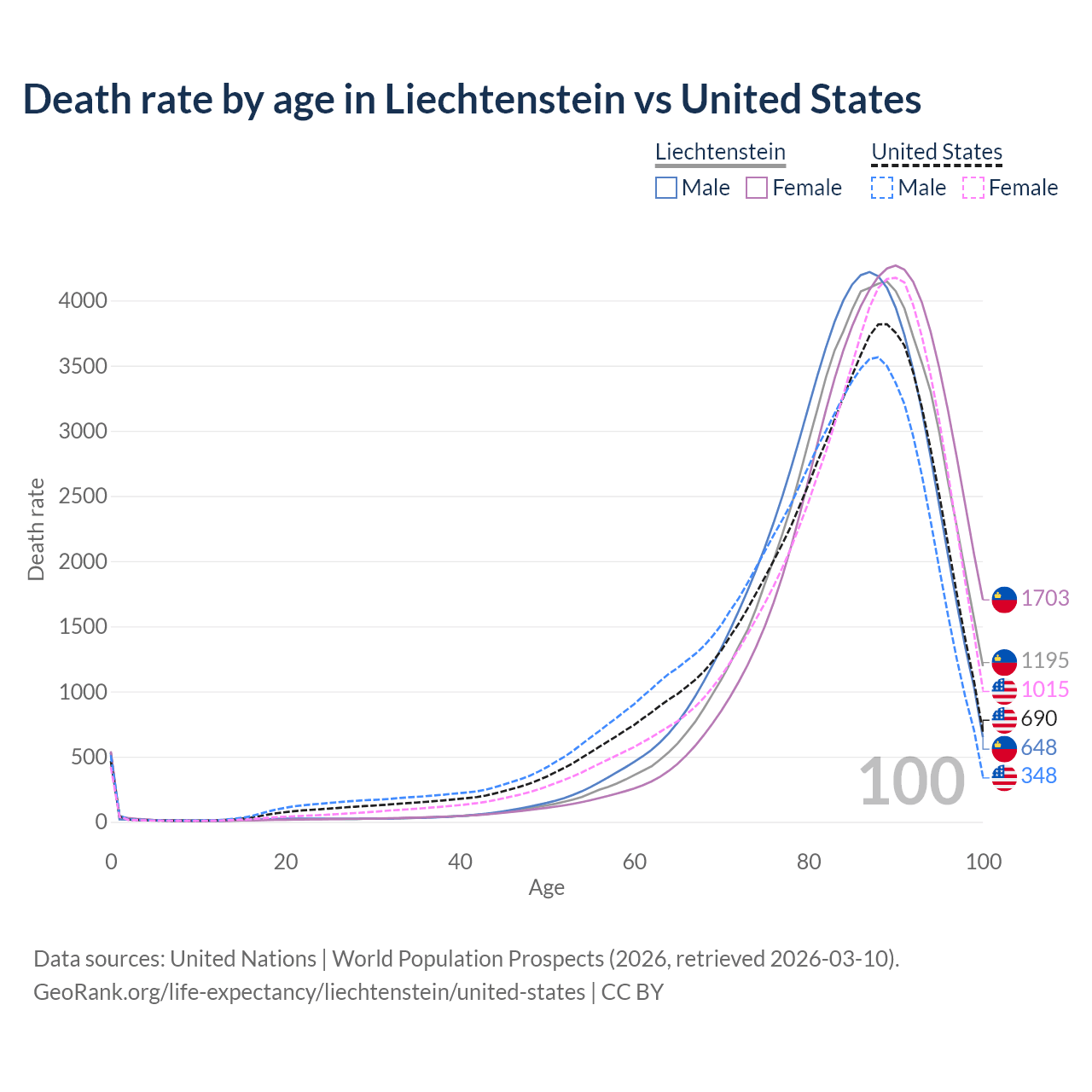 This life expectancy calculator shows the odds of living to 100, 95, 90, and below based on current age for both males and females in Liechtenstein and the United States, along with mean and median age of death. The calculations are based on the 2026 life tables (actuarial tables) from the UN World Population Prospects.
