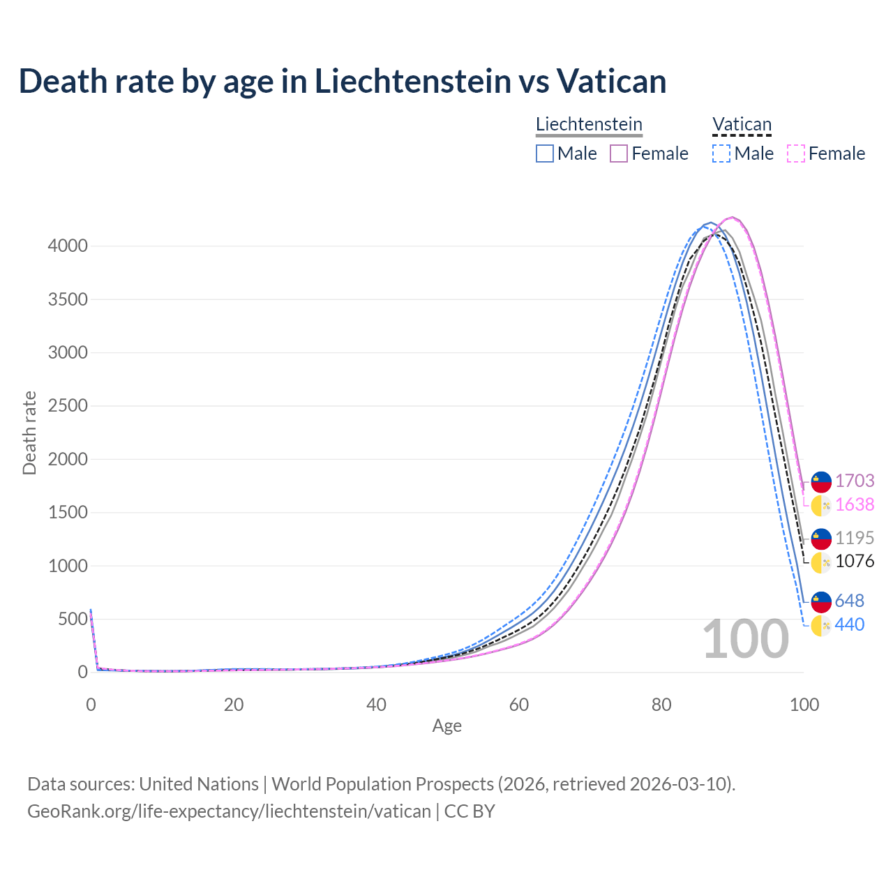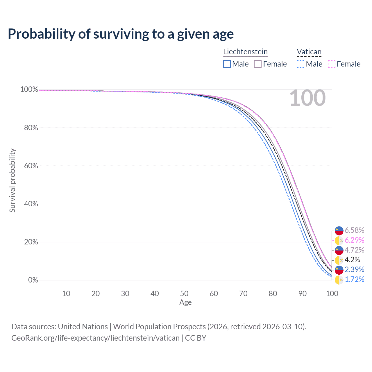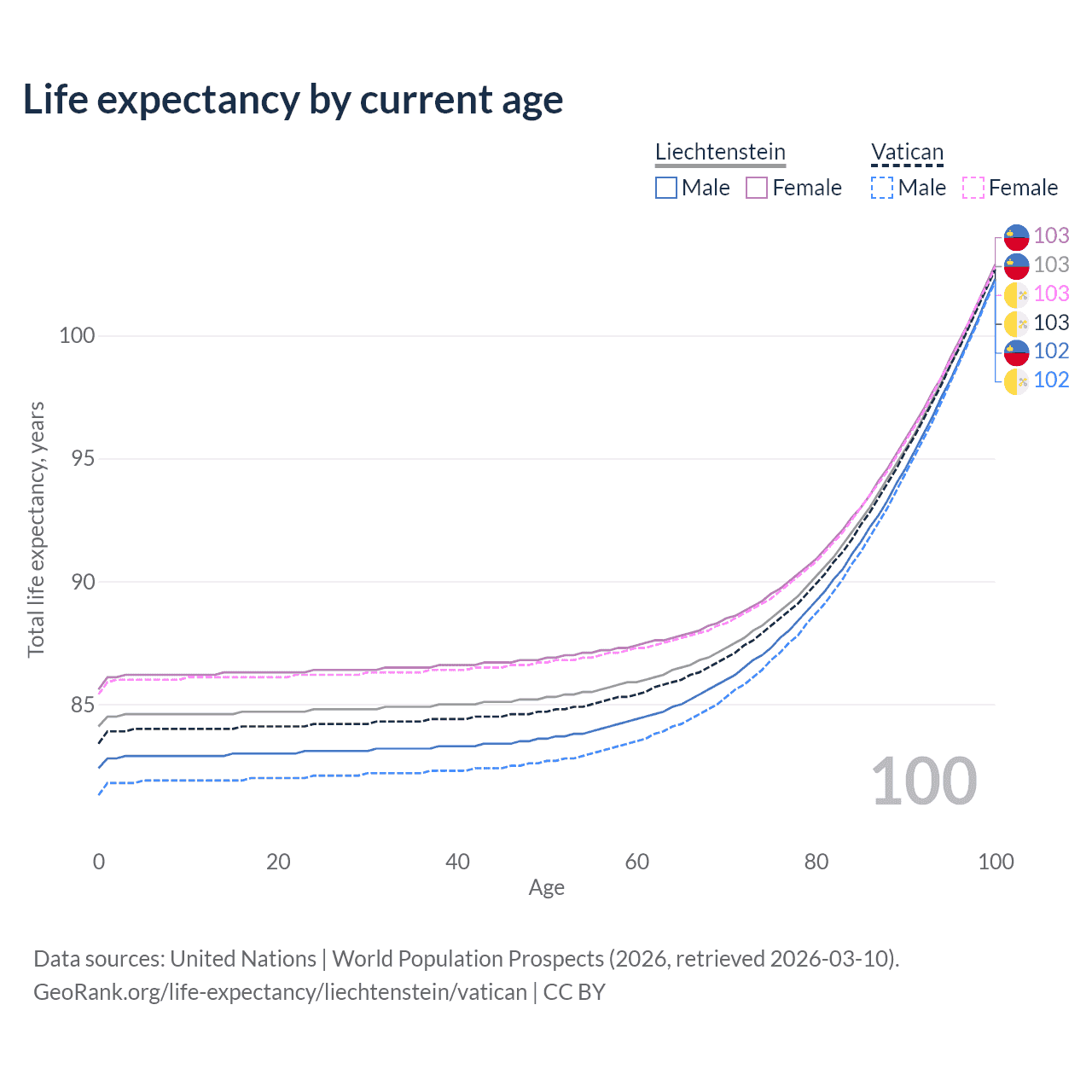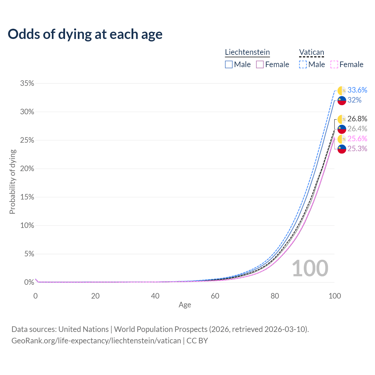 This life expectancy calculator shows the odds of living to 100, 95, 90, and below based on current age for both males and females in Liechtenstein and the Vatican, along with mean and median age of death. The calculations are based on the 2026 life tables (actuarial tables) from the UN World Population Prospects.