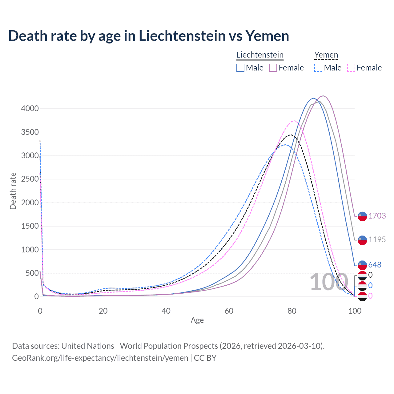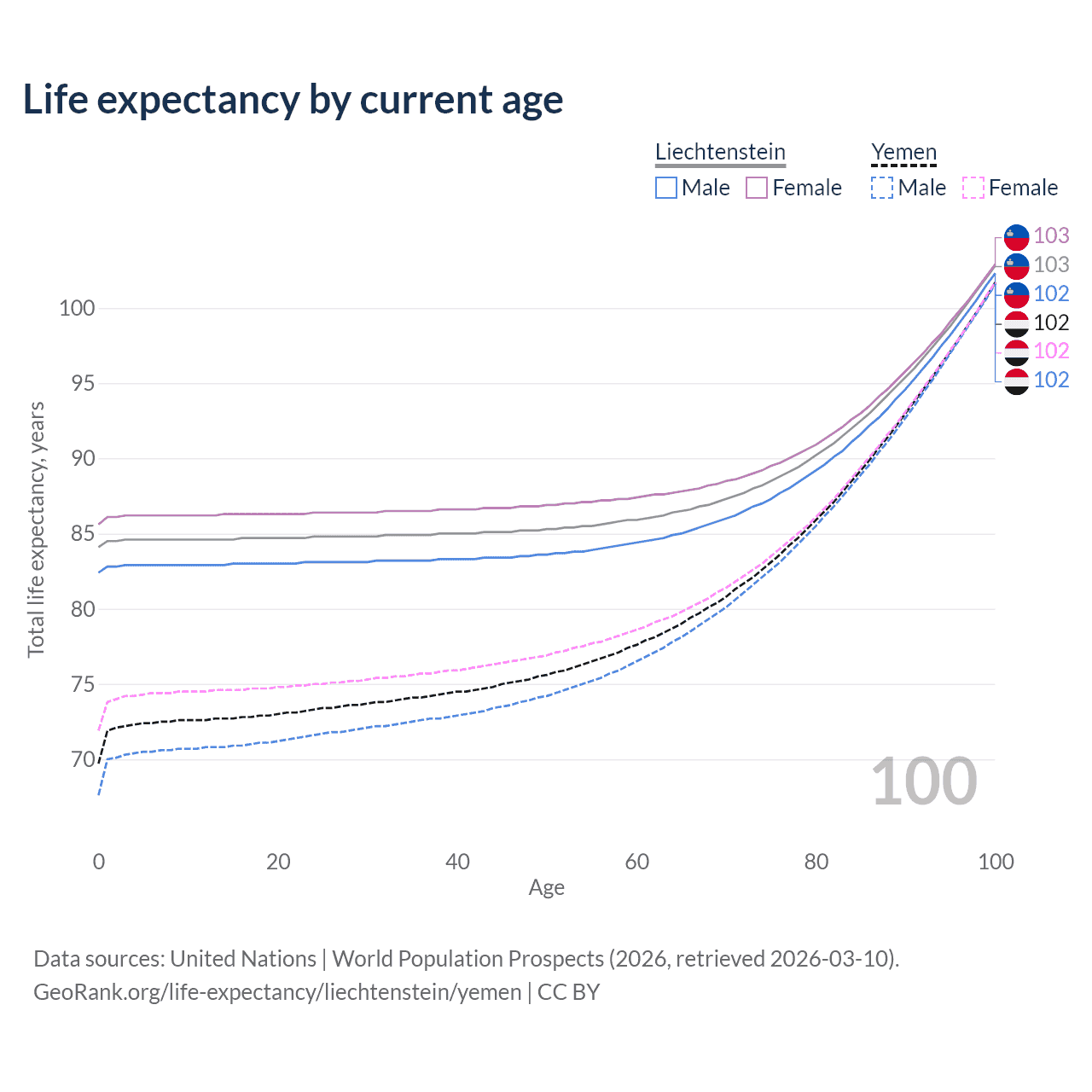 This life expectancy calculator shows the odds of living to 100, 95, 90, and below based on current age for both males and females in Liechtenstein and Yemen, along with mean and median age of death. The calculations are based on the 2026 life tables (actuarial tables) from the UN World Population Prospects.