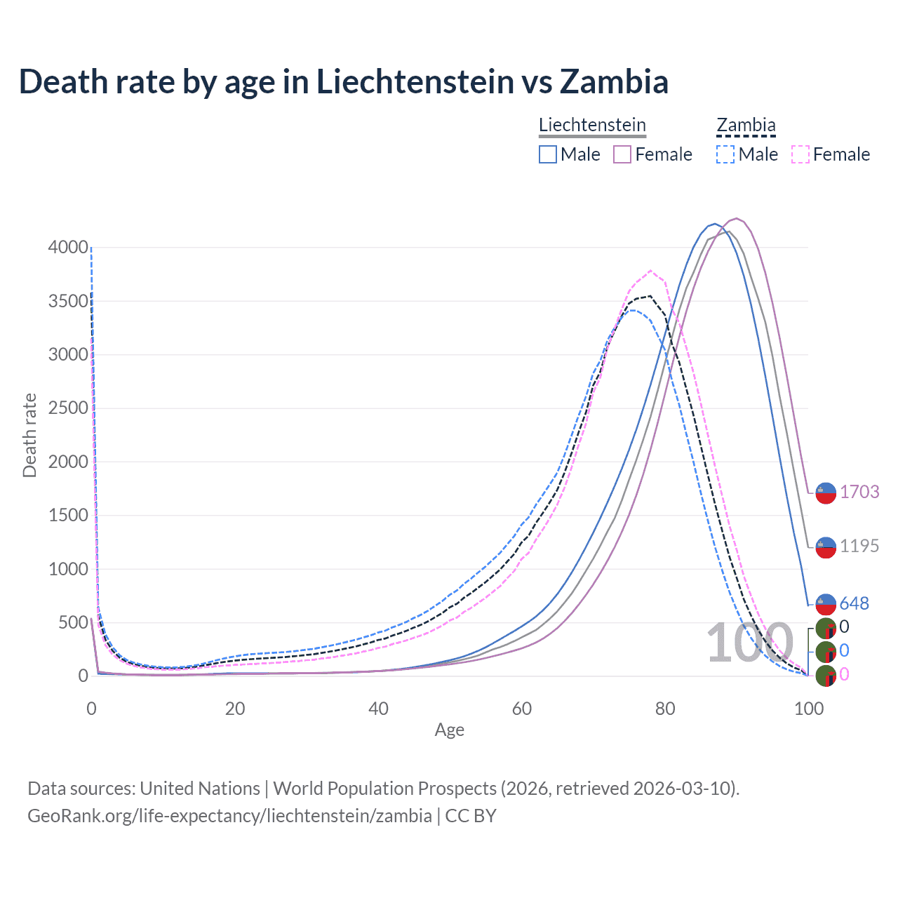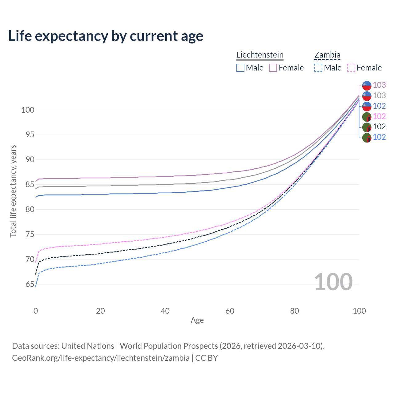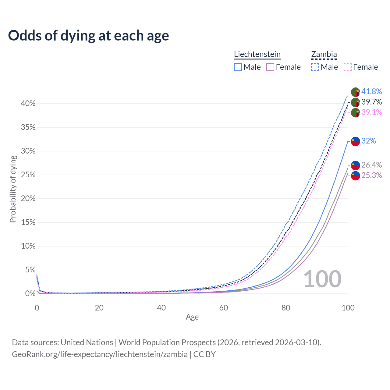 This life expectancy calculator shows the odds of living to 100, 95, 90, and below based on current age for both males and females in Liechtenstein and Zambia, along with mean and median age of death. The calculations are based on the 2026 life tables (actuarial tables) from the UN World Population Prospects.