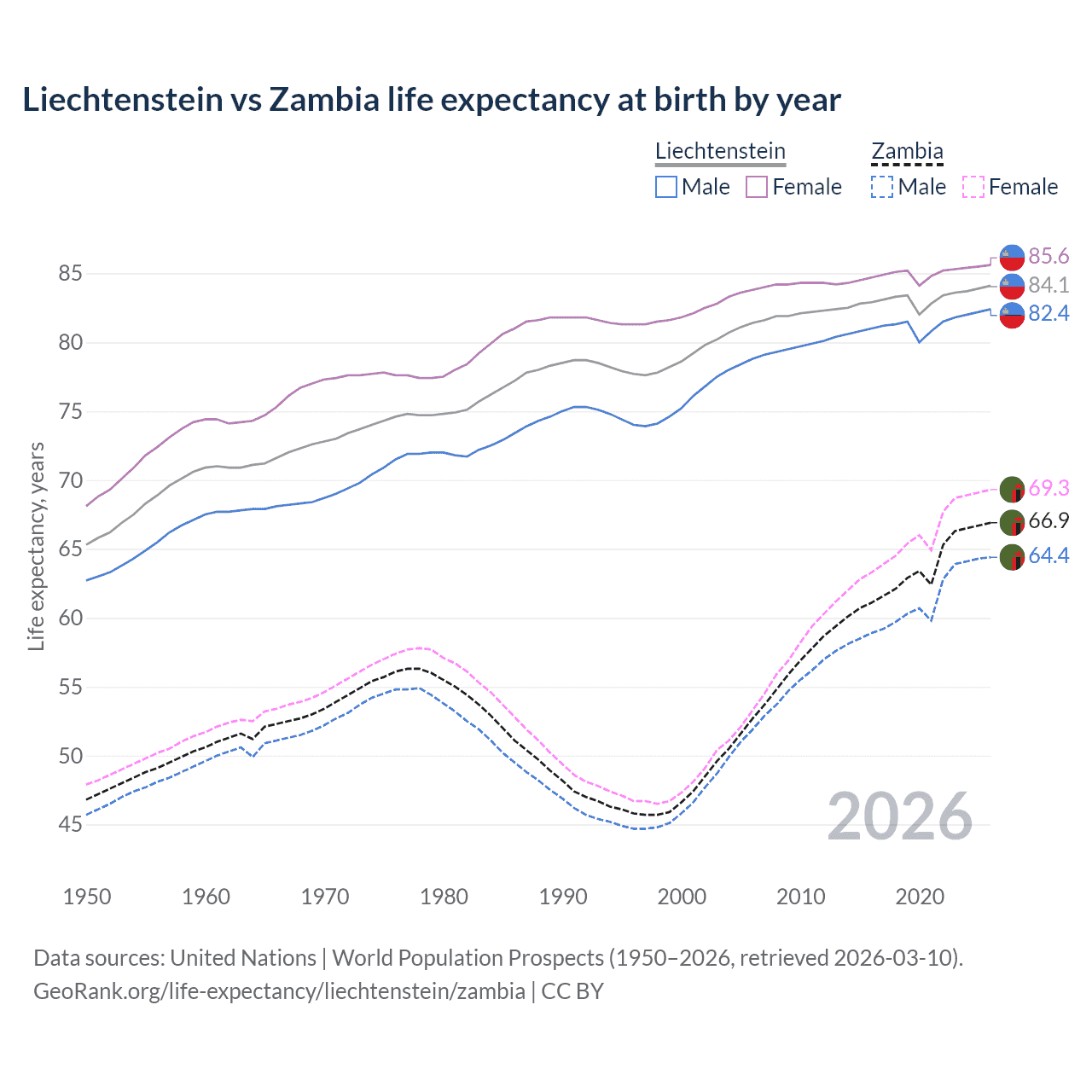 The average life expectancy at birth is 84.1 years in Liechtenstein vs 66.9 in Zambia. Liechtenstein is ranked 11/197 by life expectancy, and Zambia is 161/197. In Liechtenstein, the life expectancy is 82.4 years for males and 85.6 years for females. In Zambia, it's 64.4 years for males and 69.3 years for females.