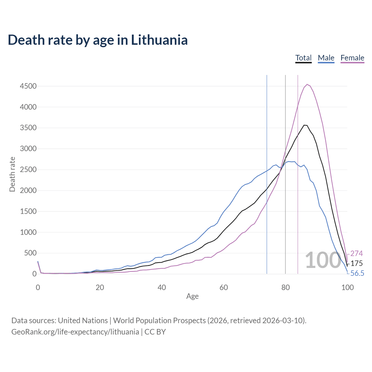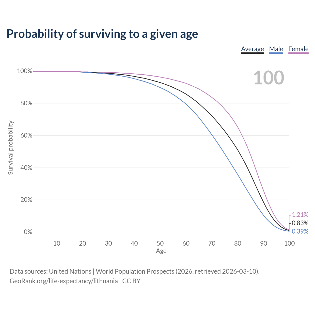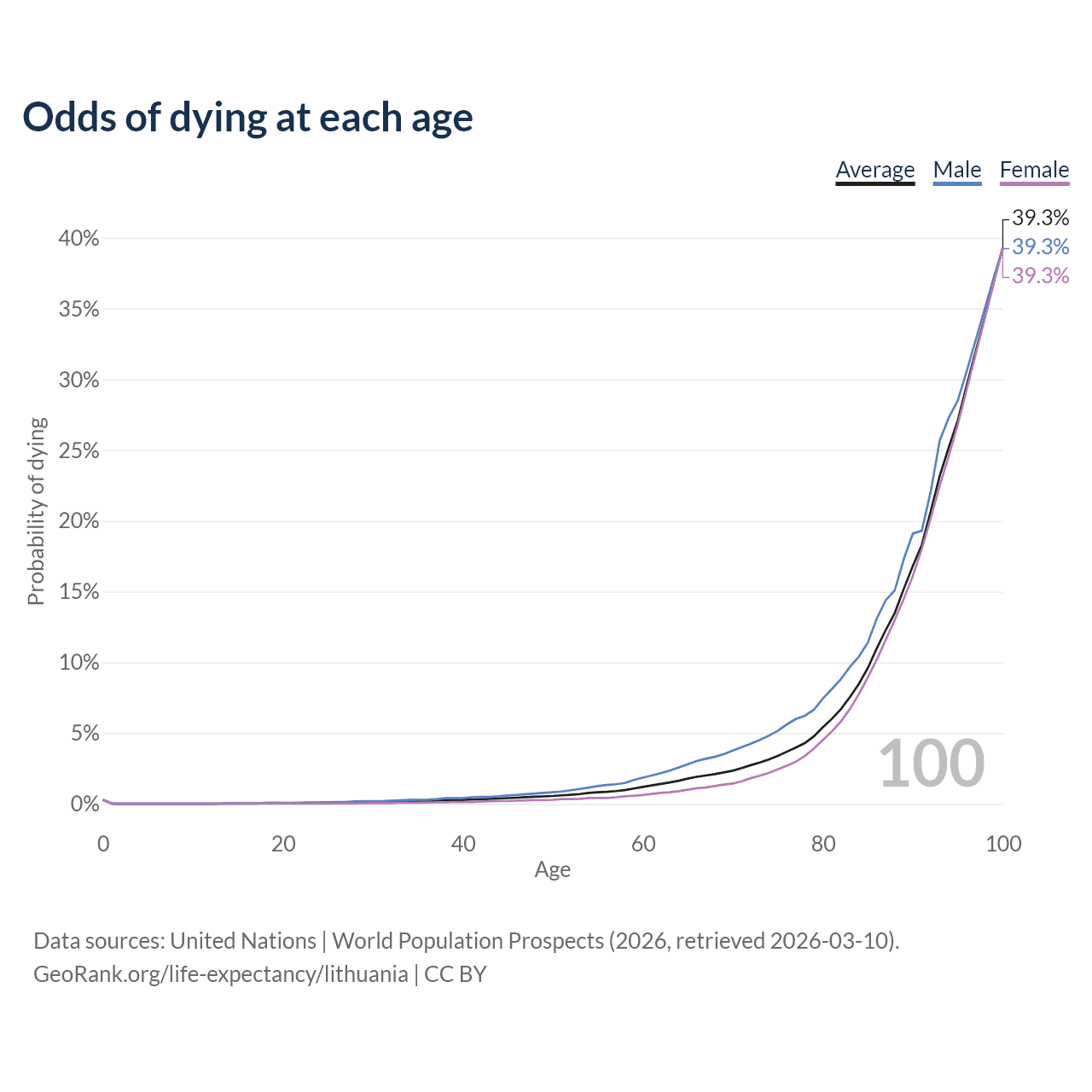 This life expectancy calculator shows the odds of living to 100, 95, 90, and below based on current age for both males and females in Lithuania, along with mean and median age of death. The calculations are based on the 2026 life tables (actuarial tables) from the UN World Population Prospects.