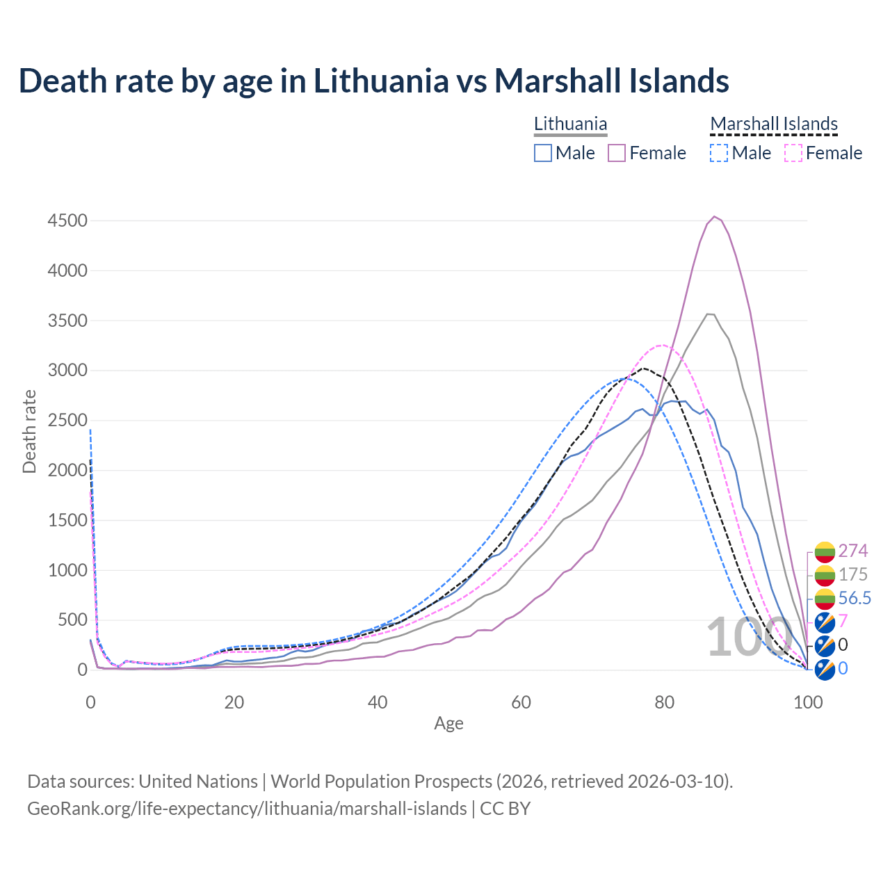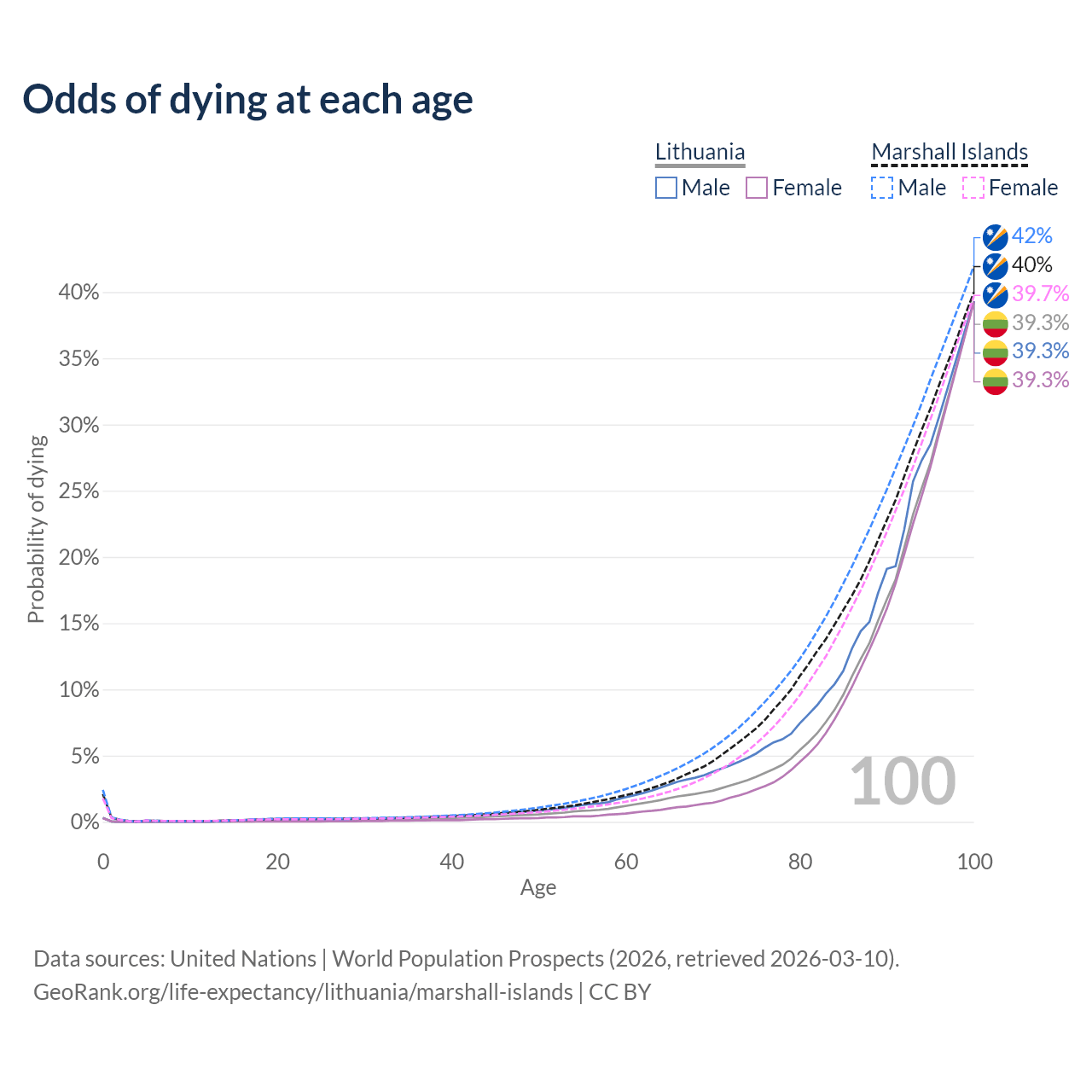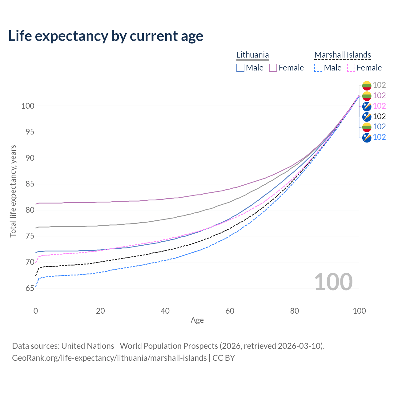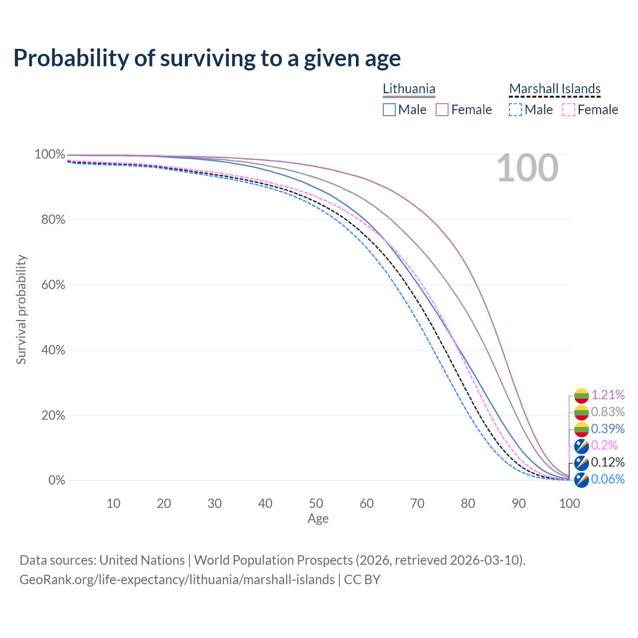 This life expectancy calculator shows the odds of living to 100, 95, 90, and below based on current age for both males and females in Lithuania and the Marshall Islands, along with mean and median age of death. The calculations are based on the 2026 life tables (actuarial tables) from the UN World Population Prospects.