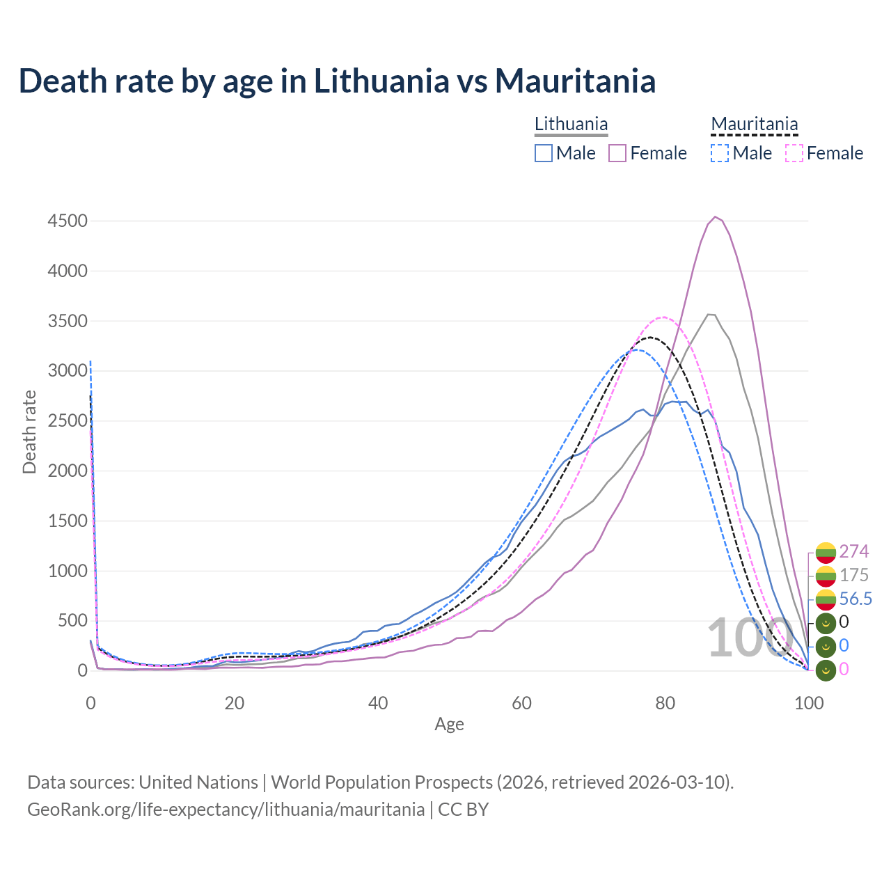 In Lithuania, the most common age of death is 86, compared to 78 in Mauritania. The median age of death is 80.4 in Lithuania and 74.1 in Mauritania, meaning only half of each cohort is expected to live past that age.