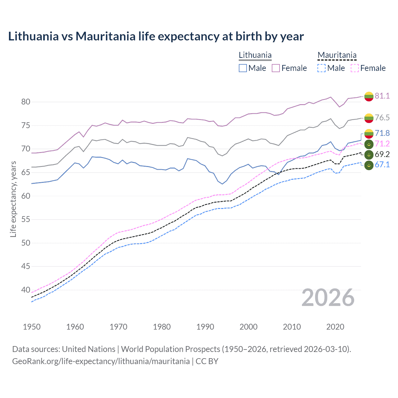 The average life expectancy at birth is 76.5 years in Lithuania vs 69.2 in Mauritania. Lithuania is ranked 80/197 by life expectancy, and Mauritania is 144/197. In Lithuania, the life expectancy is 71.8 years for males and 81.1 years for females. In Mauritania, it's 67.1 years for males and 71.2 years for females.