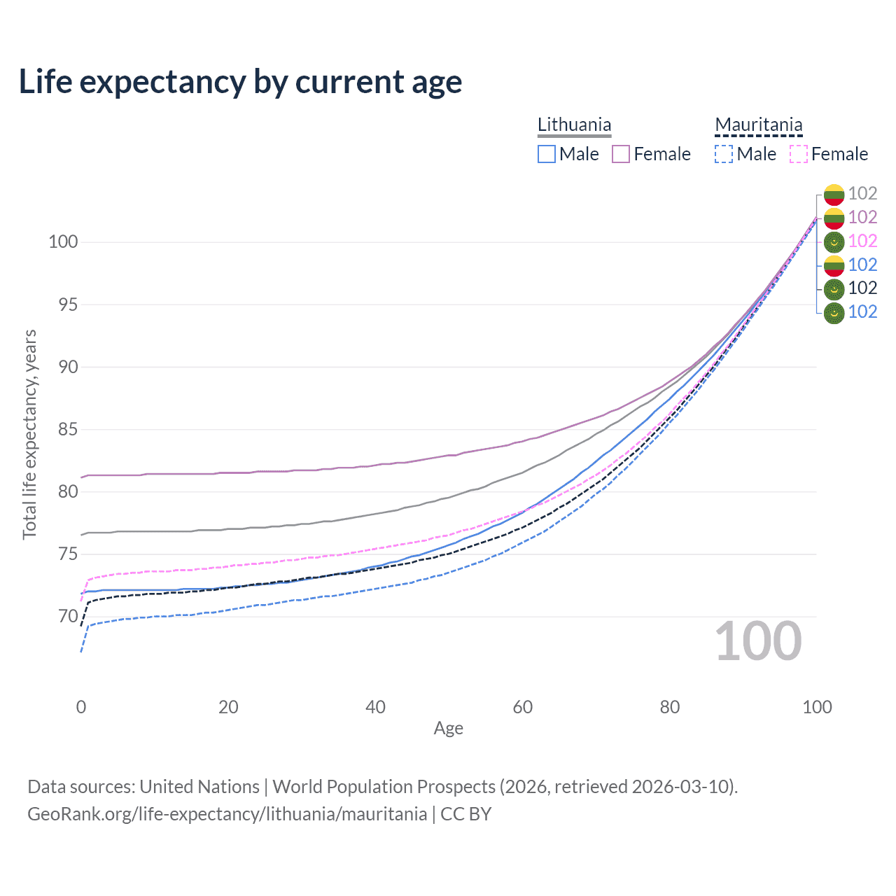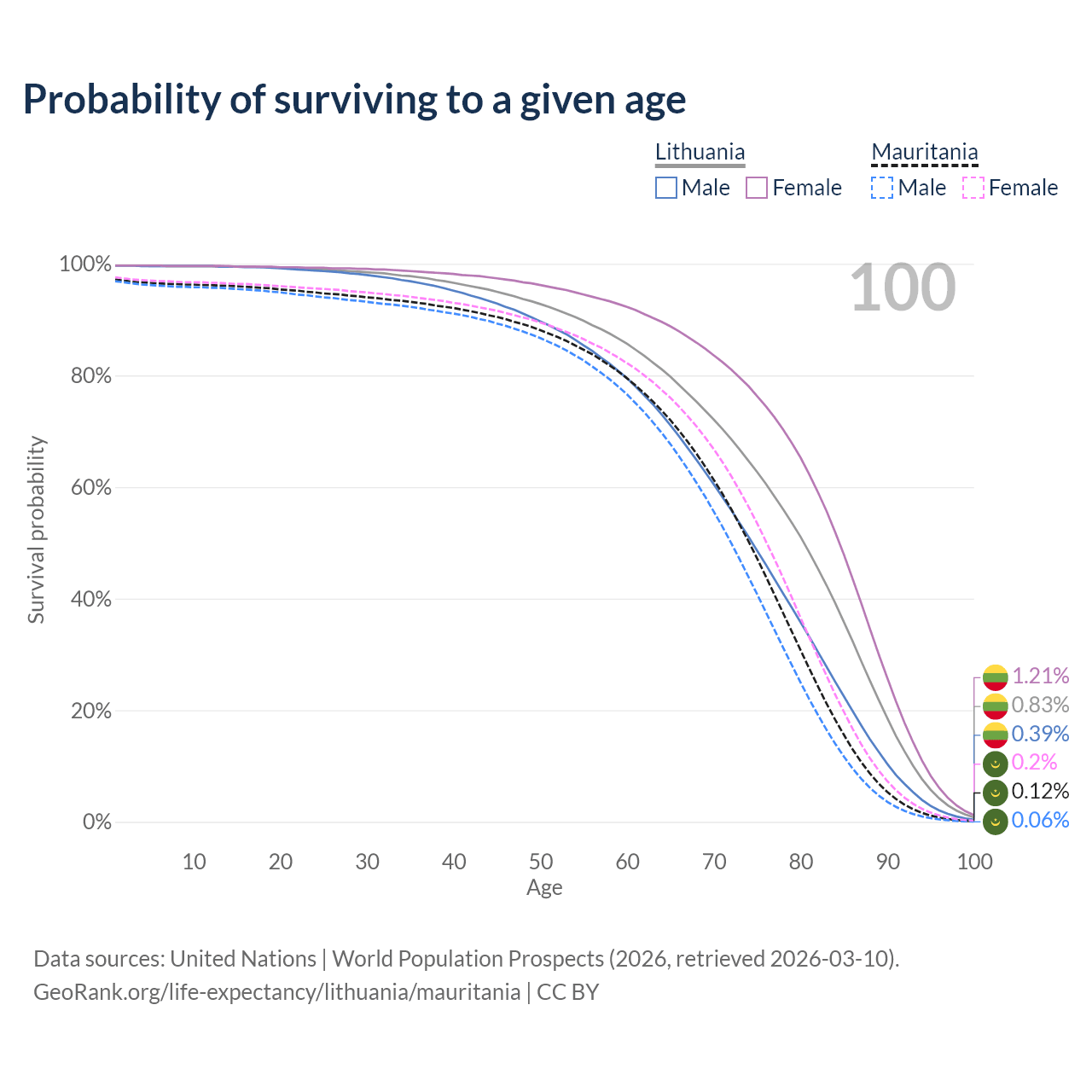 This life expectancy calculator shows the odds of living to 100, 95, 90, and below based on current age for both males and females in Lithuania and Mauritania, along with mean and median age of death. The calculations are based on the 2026 life tables (actuarial tables) from the UN World Population Prospects.